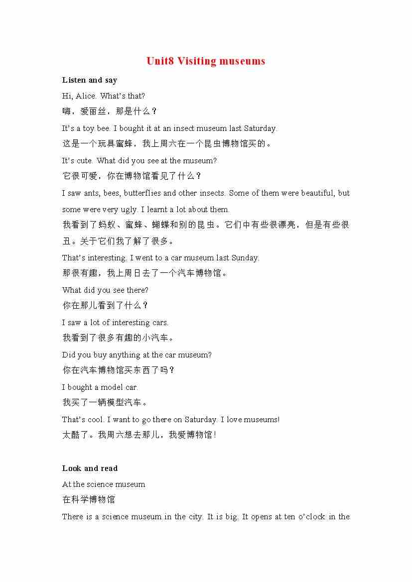 六年级英语上册素材-Unit8 Visiting museums课文翻译 沪教牛津版(深圳用)