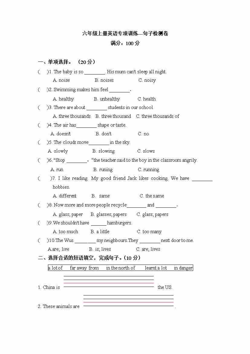 六年级上册英语期末专项训练---句子 上海牛津版(三起)(word版,含答案)