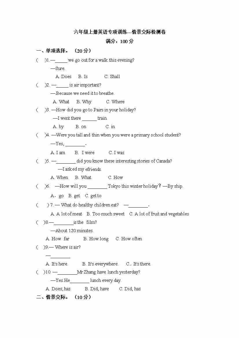 六年级上册英语期末专项训练---情景交际 上海牛津版(三起)(word版,含答案)