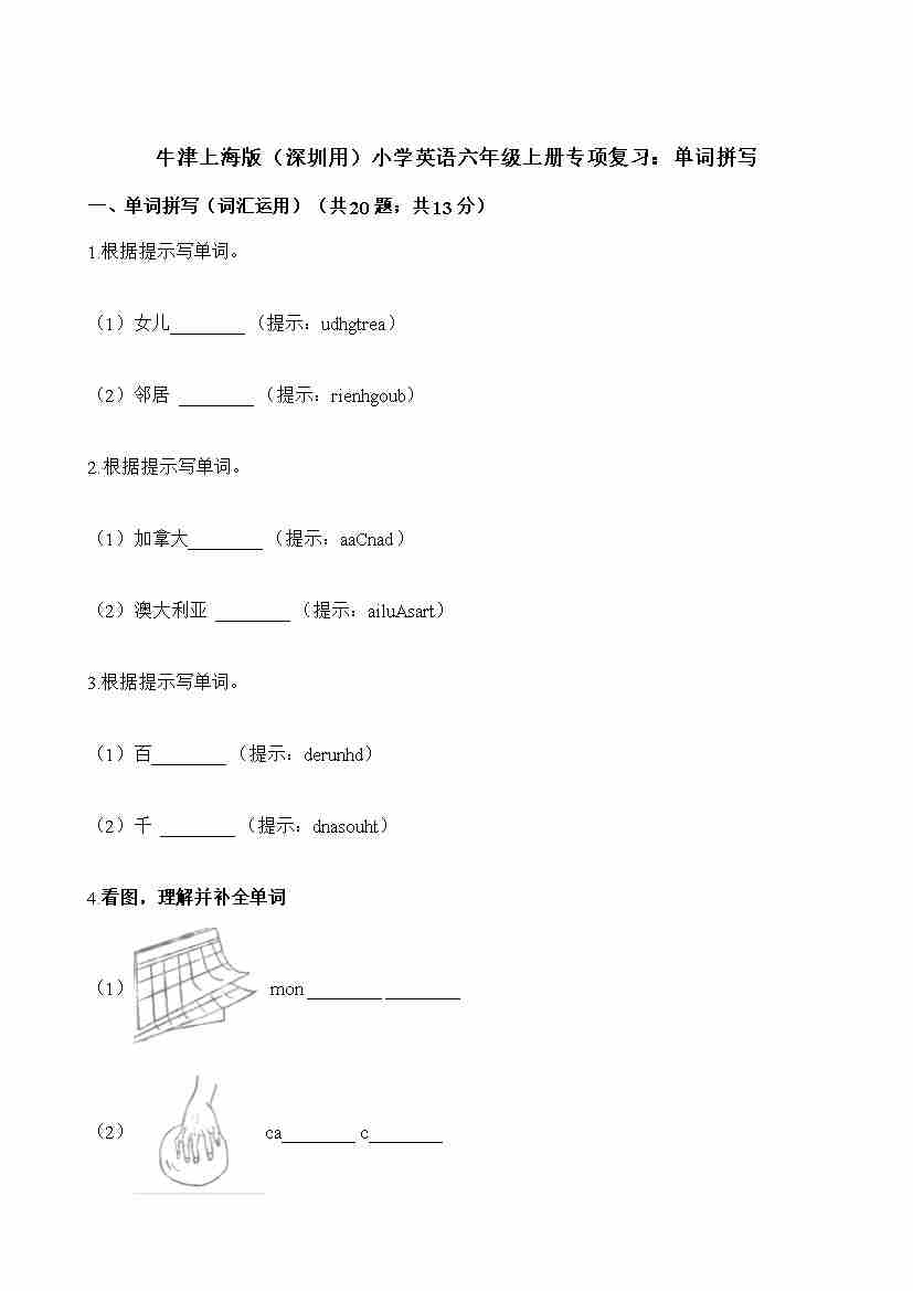 六年级上册英语试题-专项复习:单词拼写 牛津上海版(三起)(含解析)