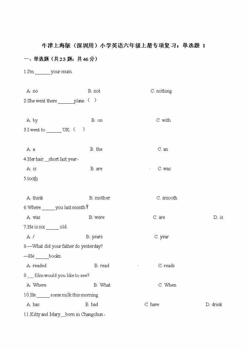 六年级上册英语试题-专项复习:单选题 1 牛津上海版(三起)(含解析)