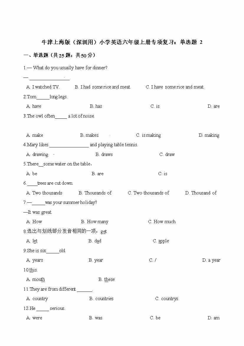 六年级上册英语试题-专项复习:单选题 2 牛津上海版(三起)(含解析)