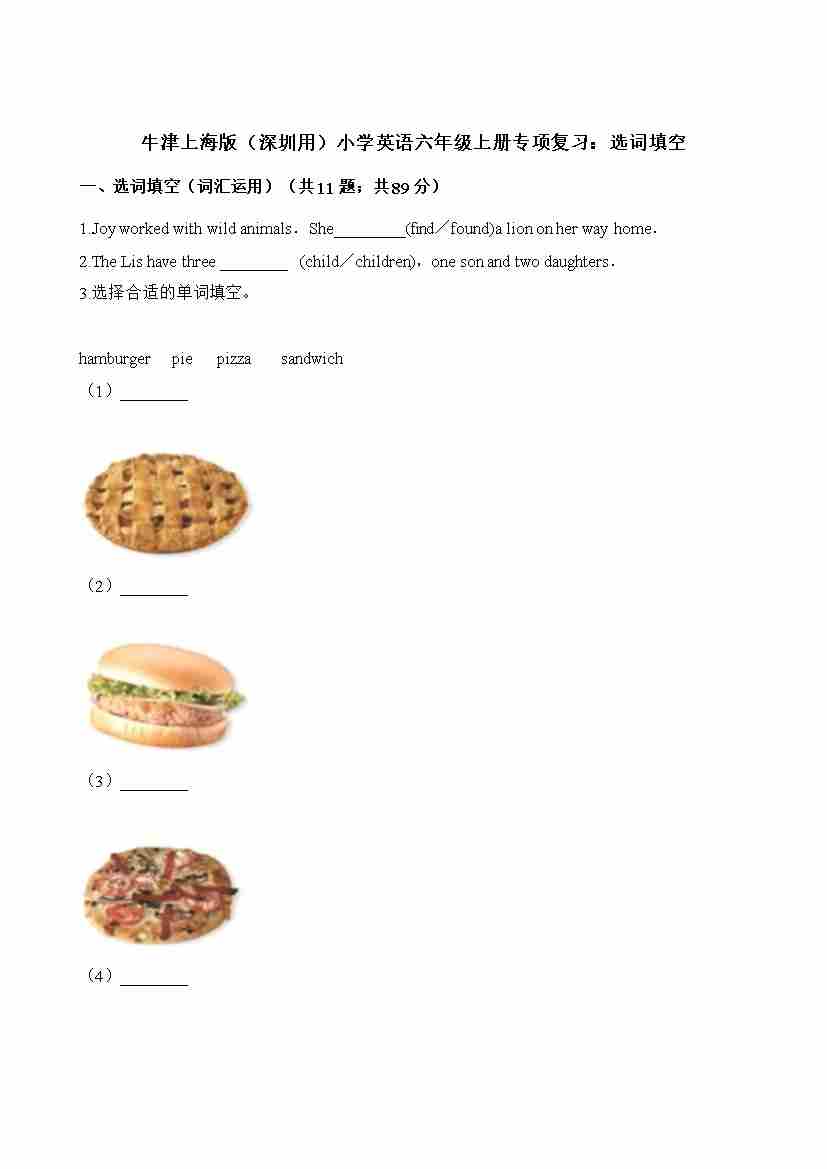 六年级上册英语试题-专项复习:选词填空 牛津上海版(三起)(含解析)