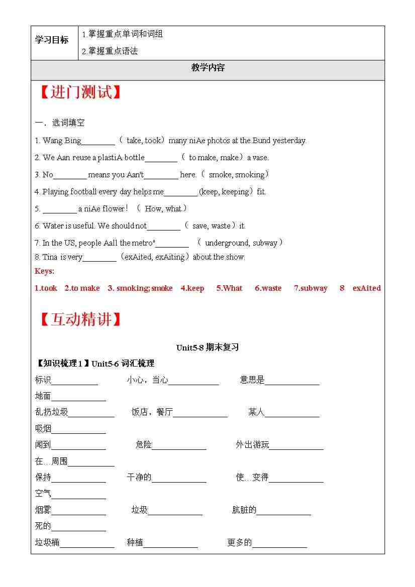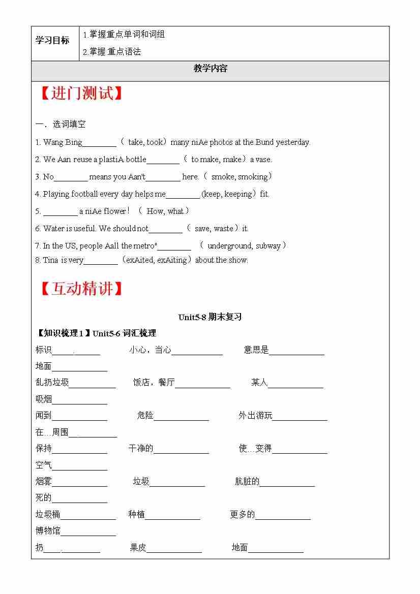 六年级英语寒假讲义第3讲 6AU58复习 (教师版)译林版(三起)