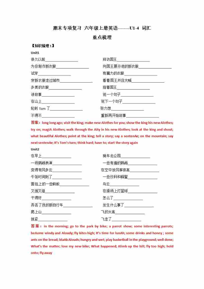 专题01 U1-4词汇-六年级英语上册寒假专项提升(教师版)(译林版三起)