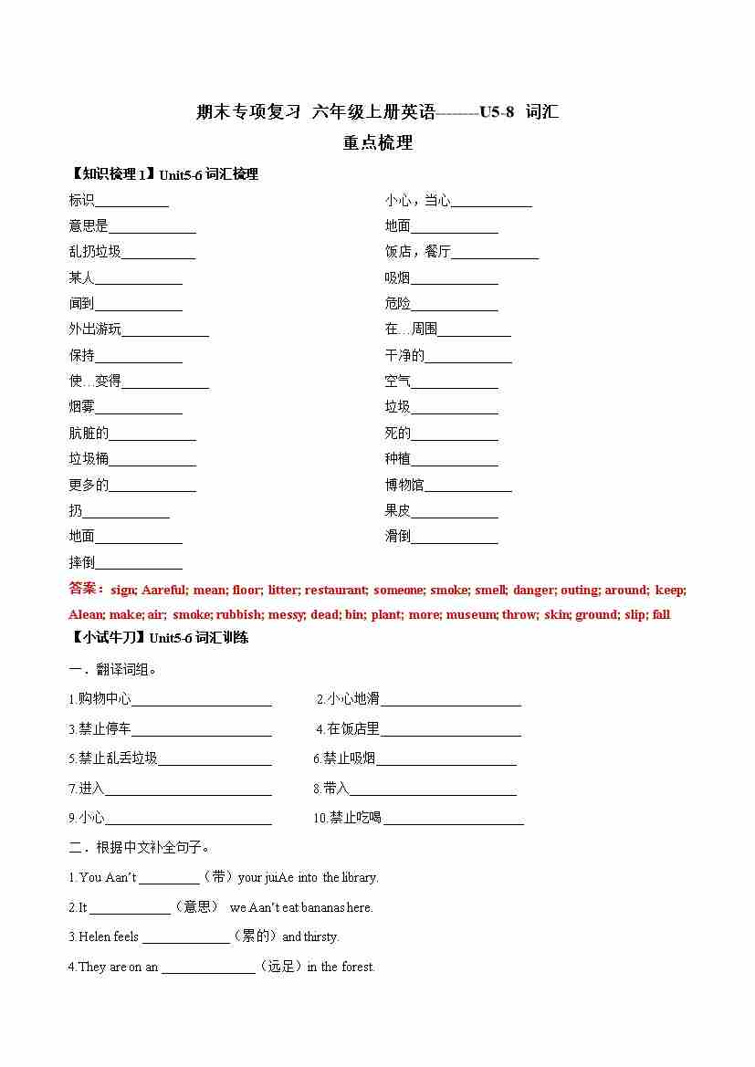 专题02 U5-8词汇-六年级英语上册寒假专项提升(教师版)(译林版三起)