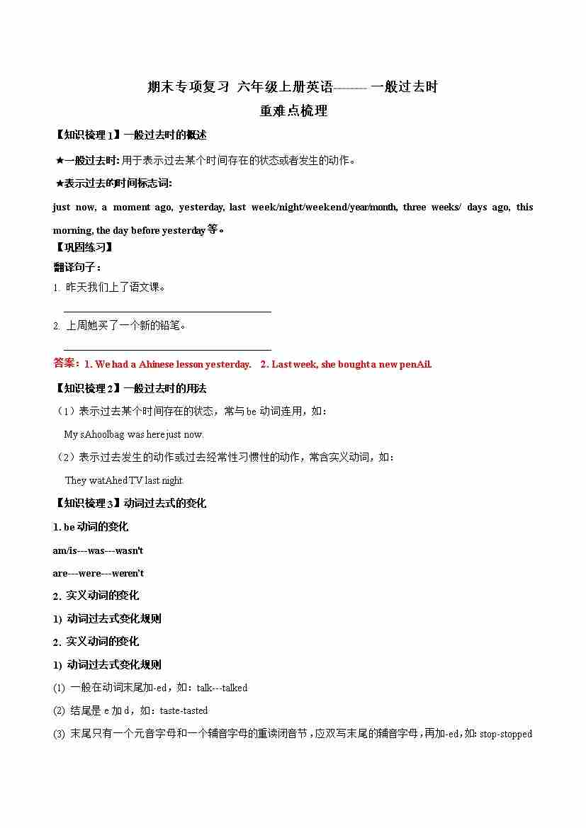 专题05 一般过去时-六年级英语上册寒假专项提升(教师版)(译林版三起)