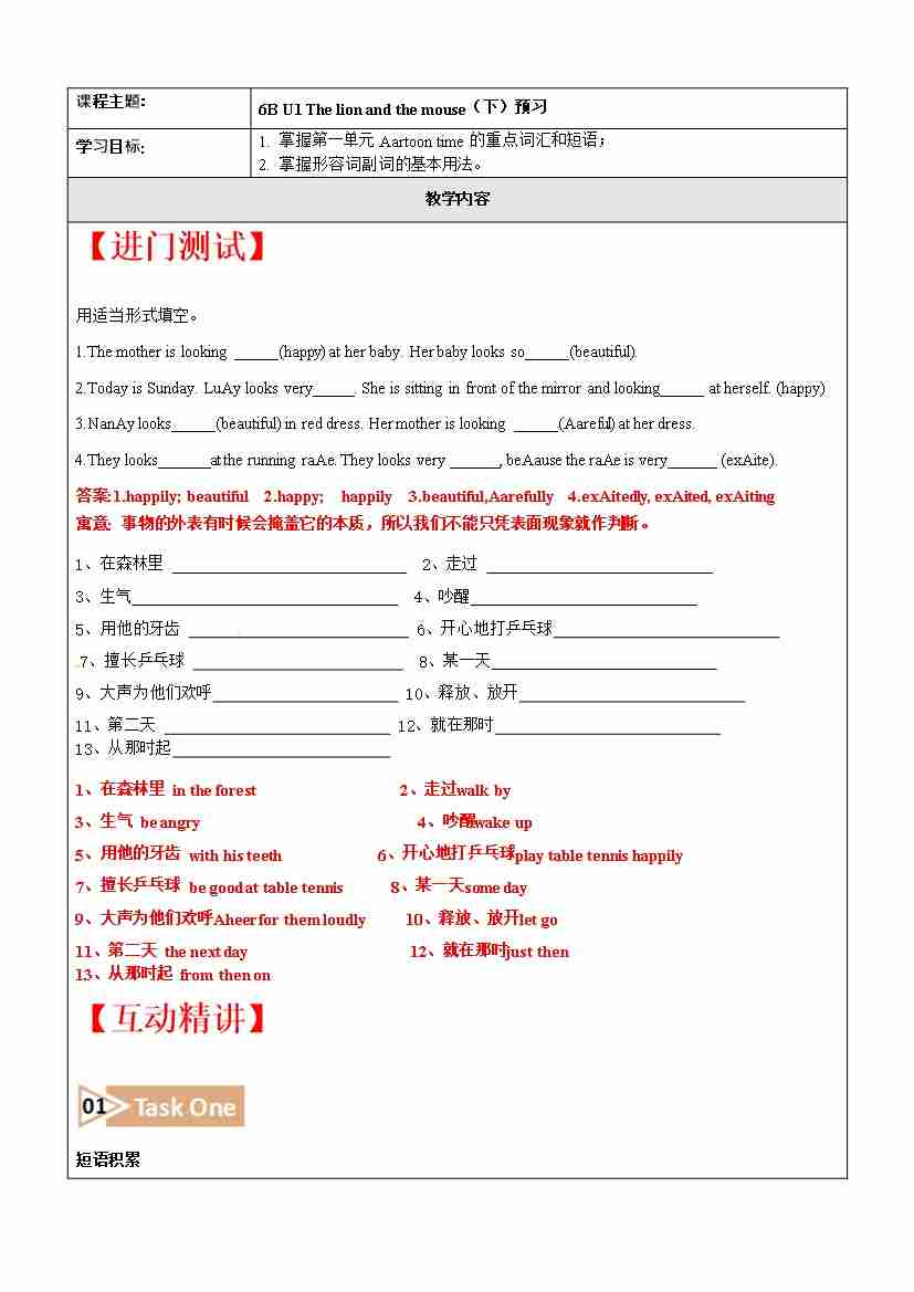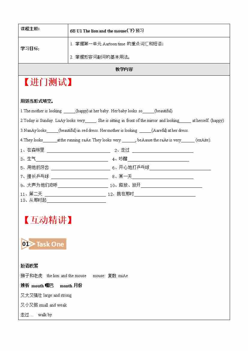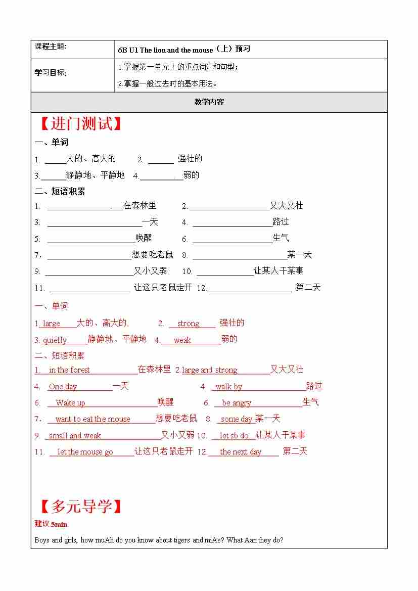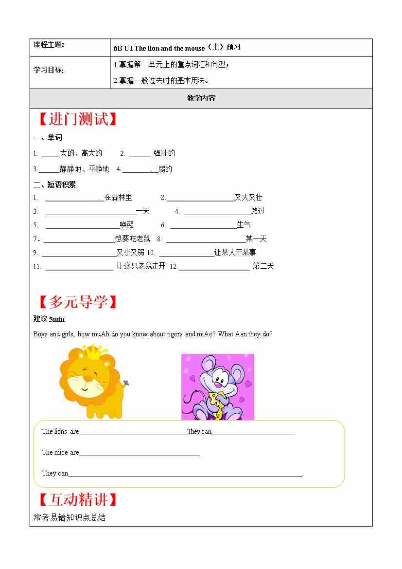 六年级英语寒假讲义第9讲 6B U1 The lion and the mouse (上)(教师版)