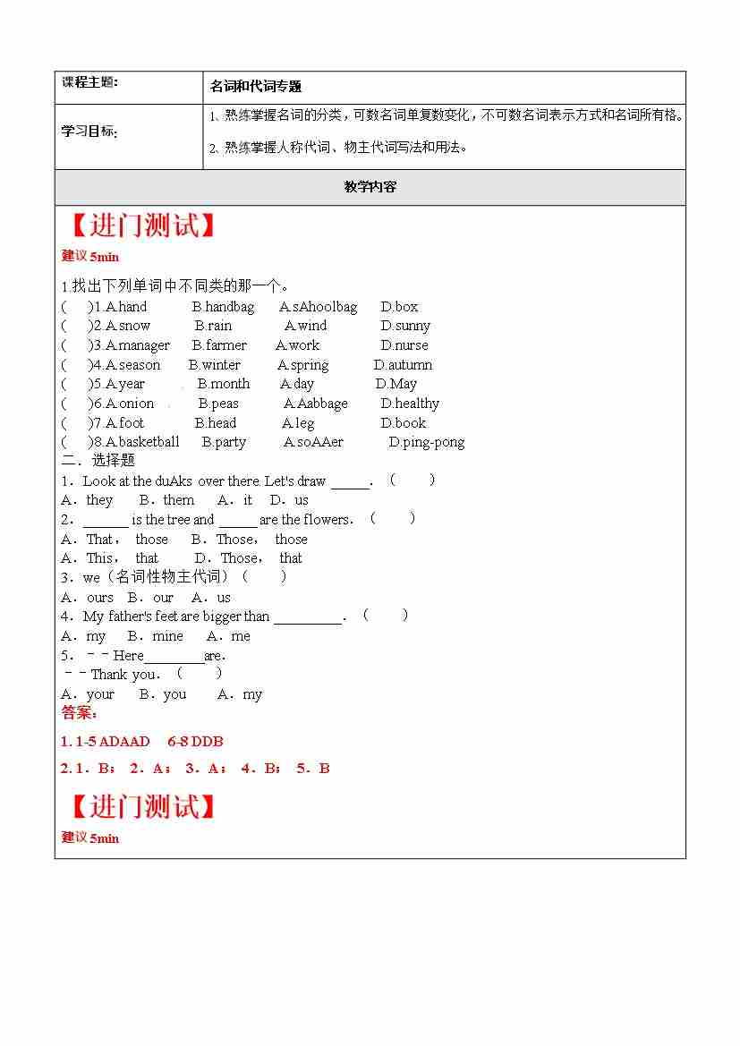 六年级英语寒假讲义第5讲 名词和代词专题 (教师版)译林版(三起)