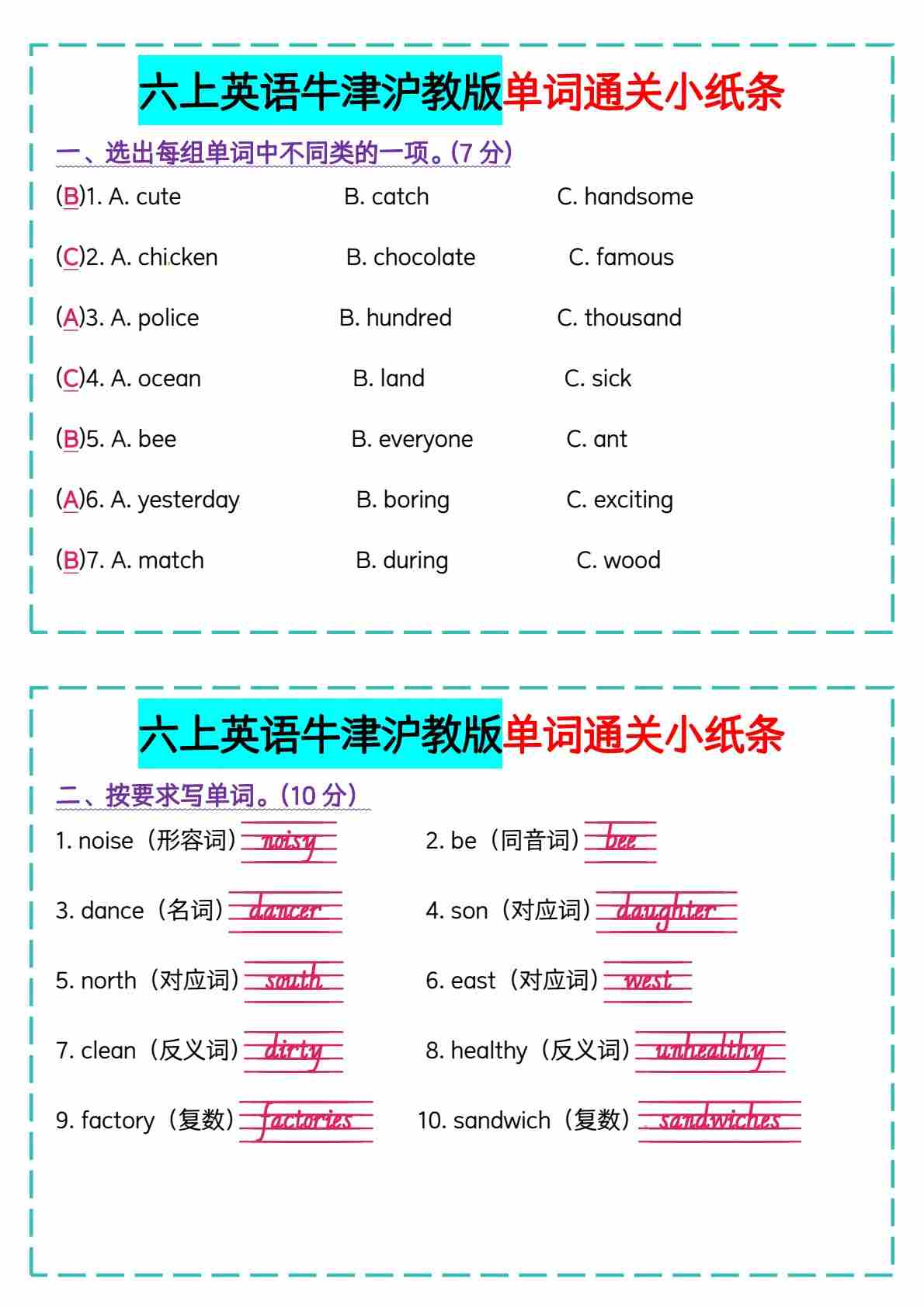 六上英语牛津沪教版单词通关小纸条