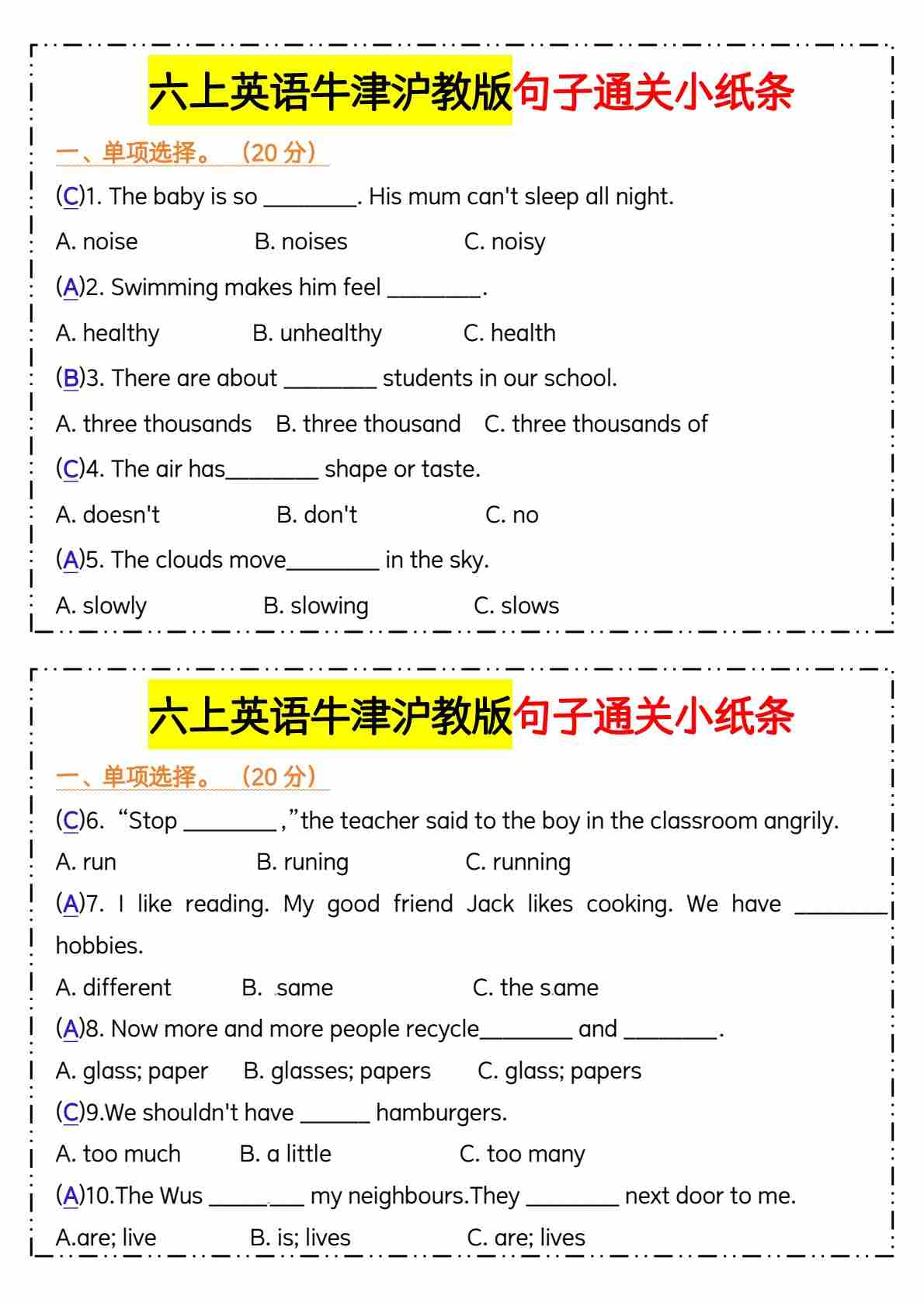 六上英语牛津沪教版句子通关小纸条