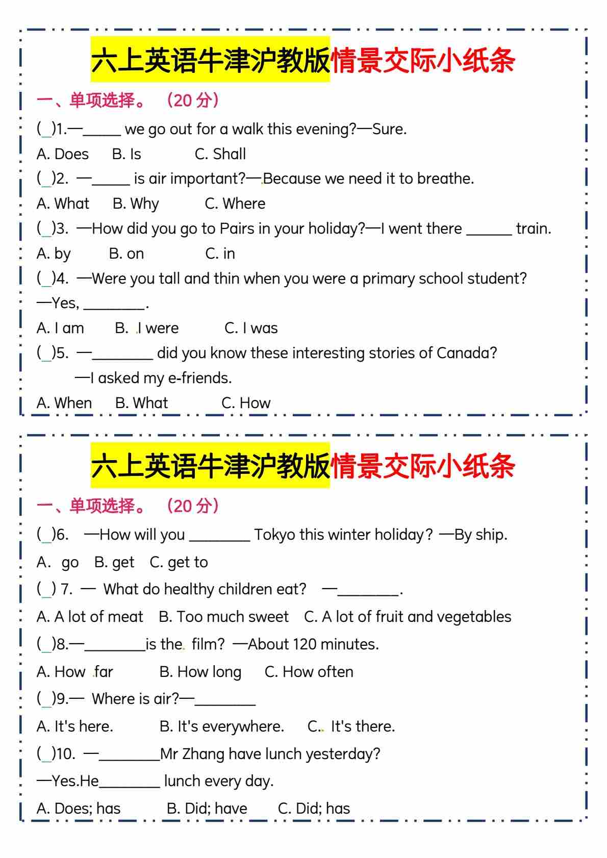 六上英语牛津沪教版情景交际小纸条