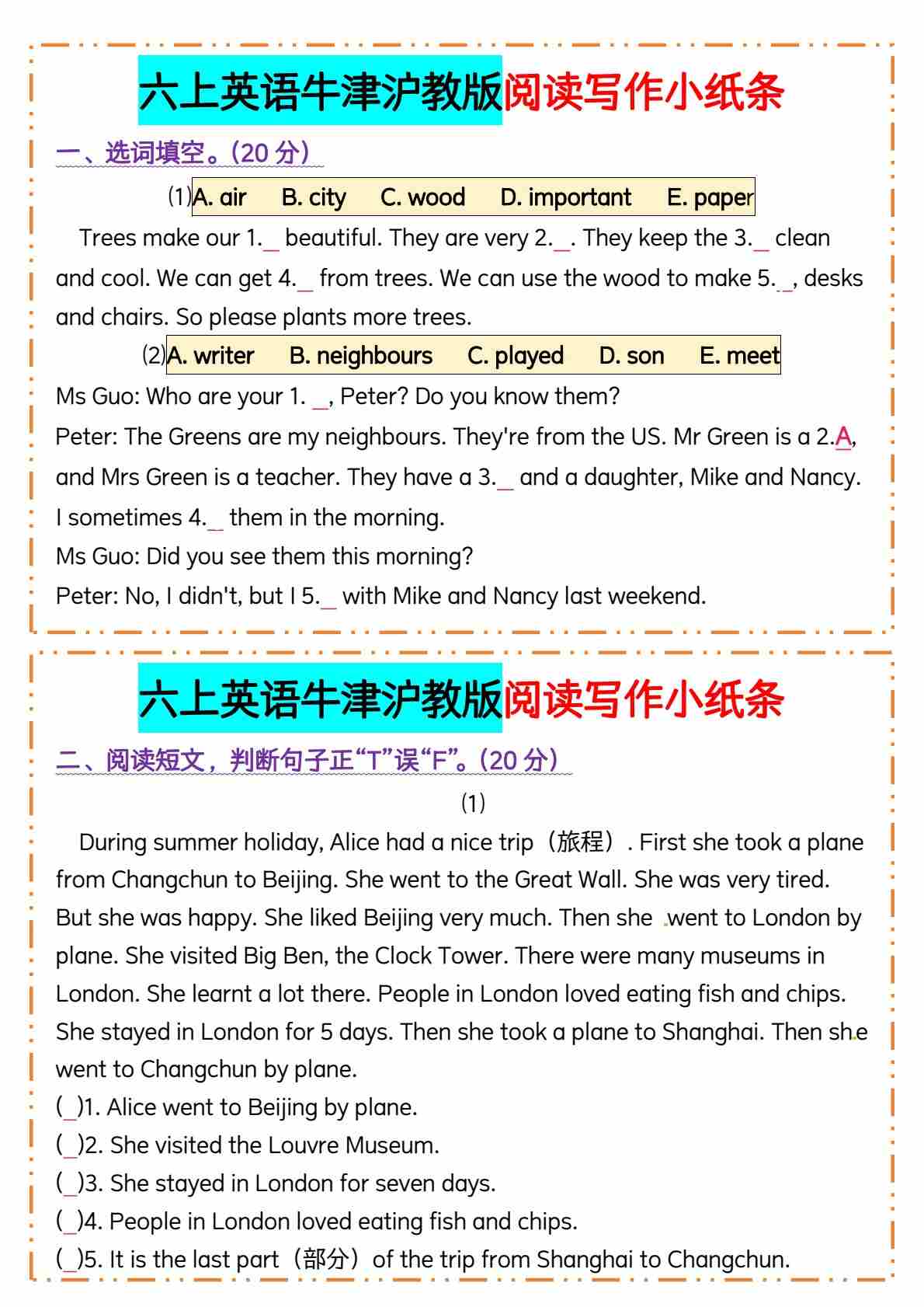 六上英语牛津沪教版阅读写作小纸条
