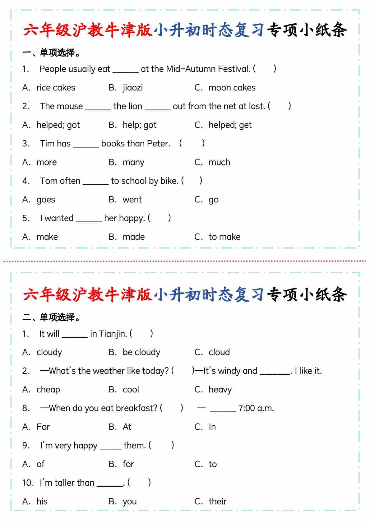 六年级沪教牛津版小升初时态复习专项小纸条