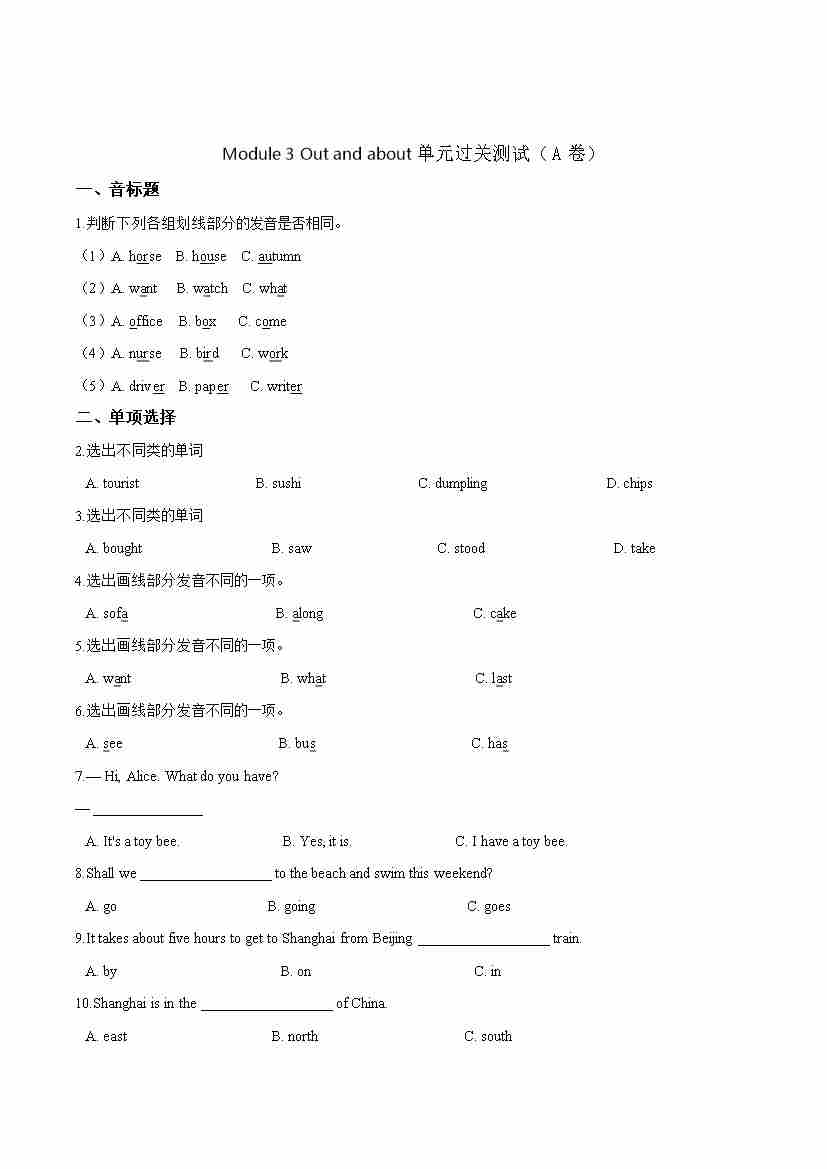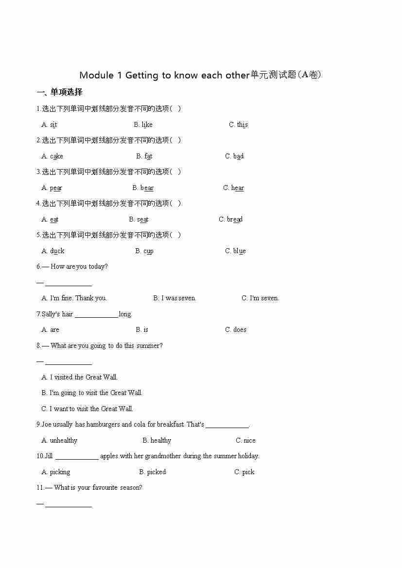 第一单元测试(A卷) -Module 1 Getting to know each other 牛津上海版(三起)(word版,含答案解析)