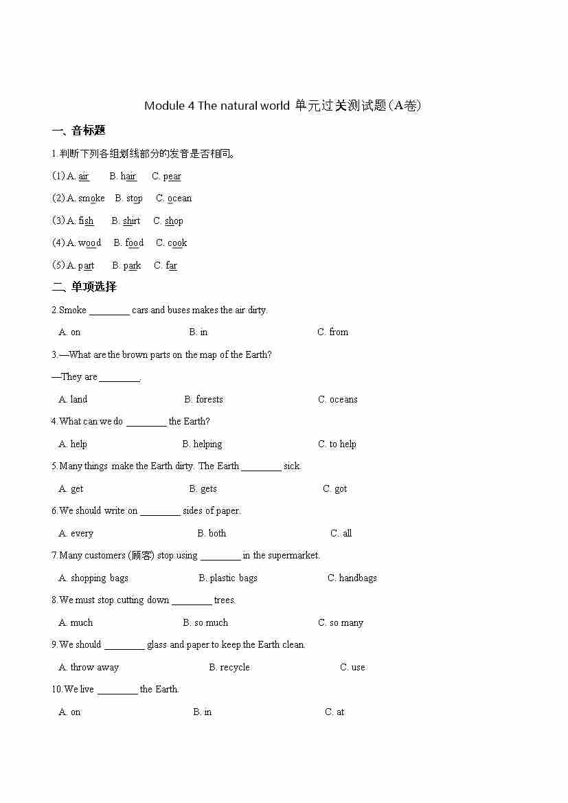 第四单元过关测试(A卷) -Module 4 The natural world 牛津上海版(三起)(word版,含答案解析)