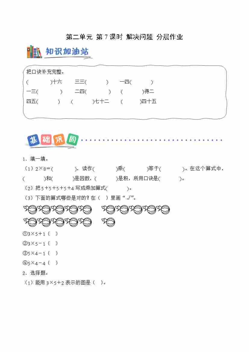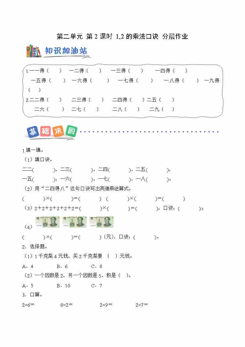 第二单元 第2课时 1,2的乘法口诀(分层作业)