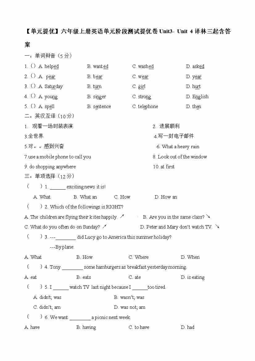Unit 3- Unit 4 单元提优 六上英语-译林三起含答案