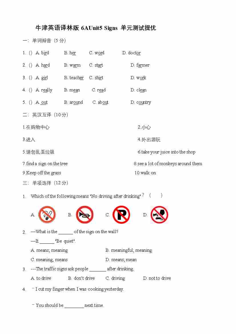 Unit 5 Signs 单元提优 六上英语-译林三起含答案
