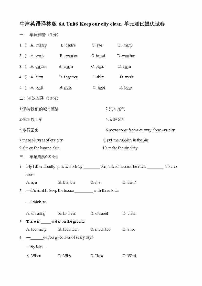 Unit 6 Keep our city clean 单元提优 六上英语-译林三起含答案