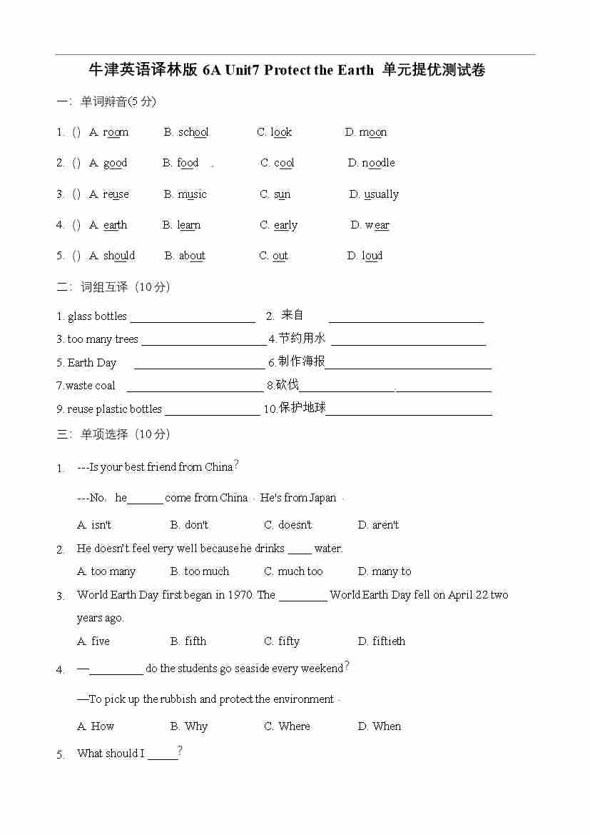 Unit 7 Protect the Earth 单元提优 六上英语单元阶段测试提优卷-译林三起含答案