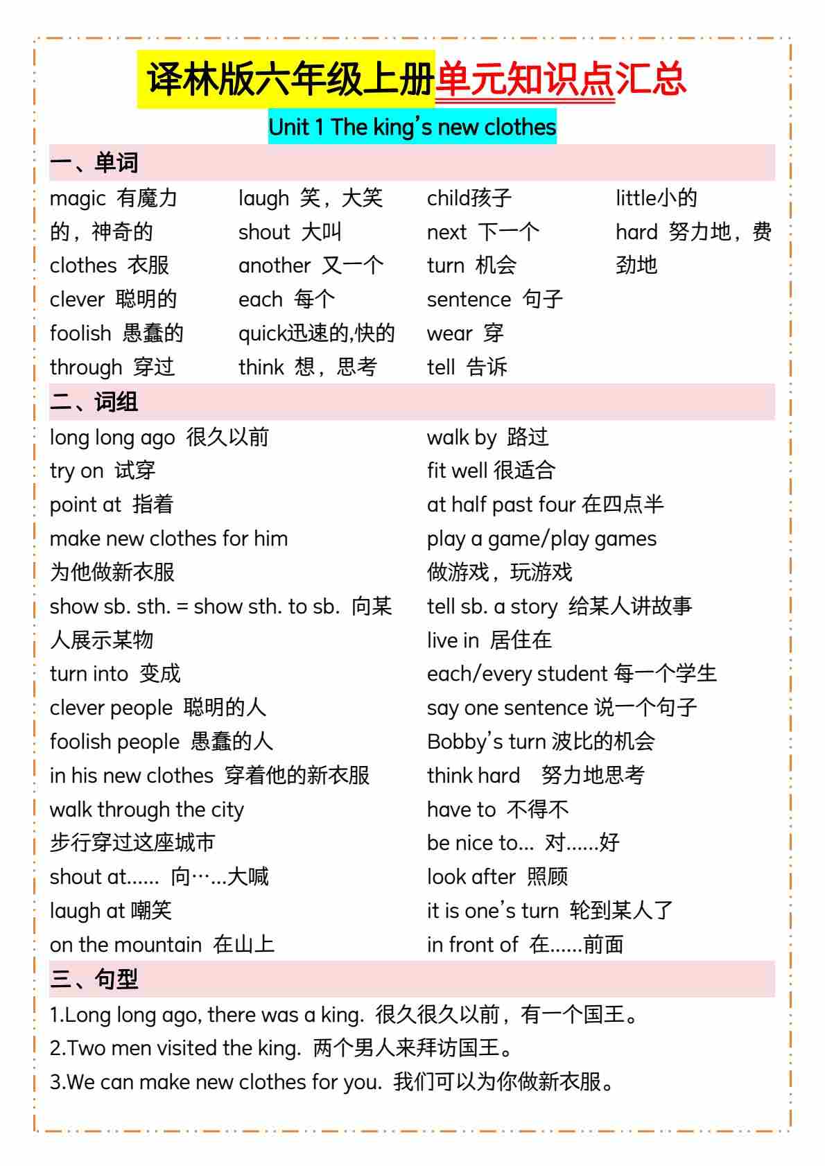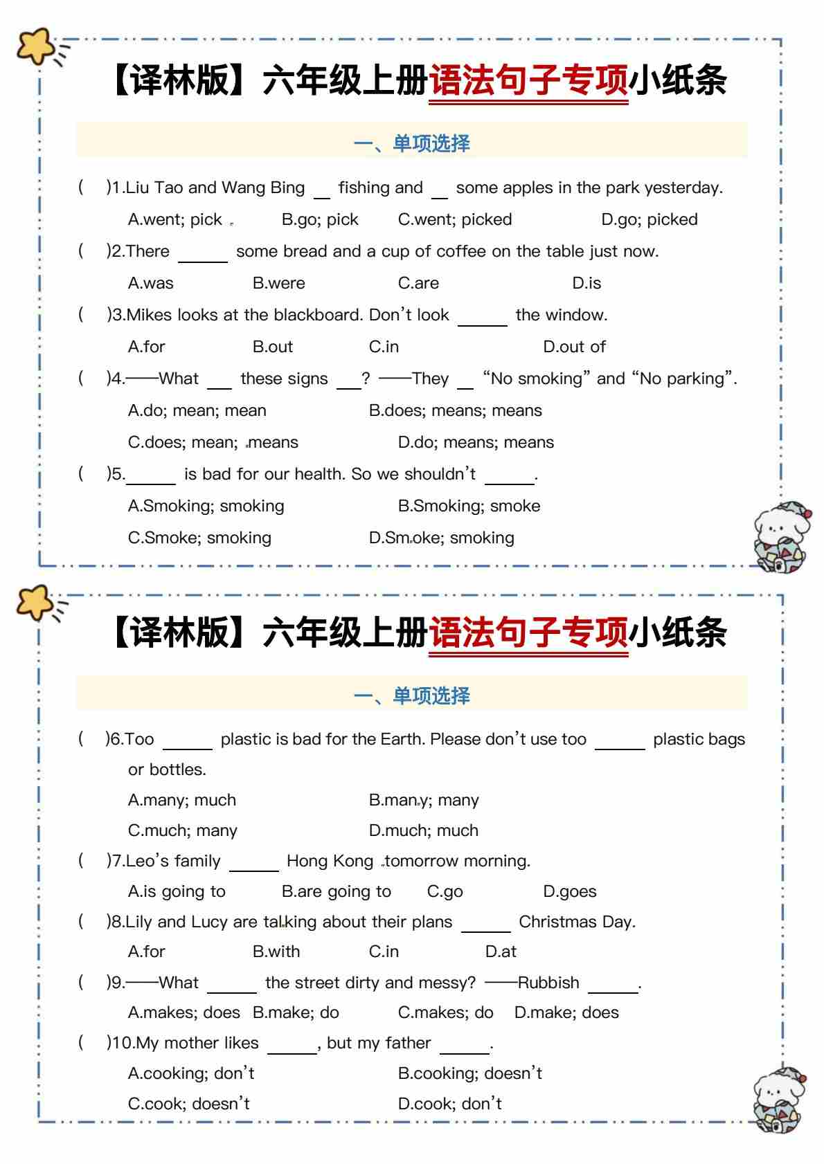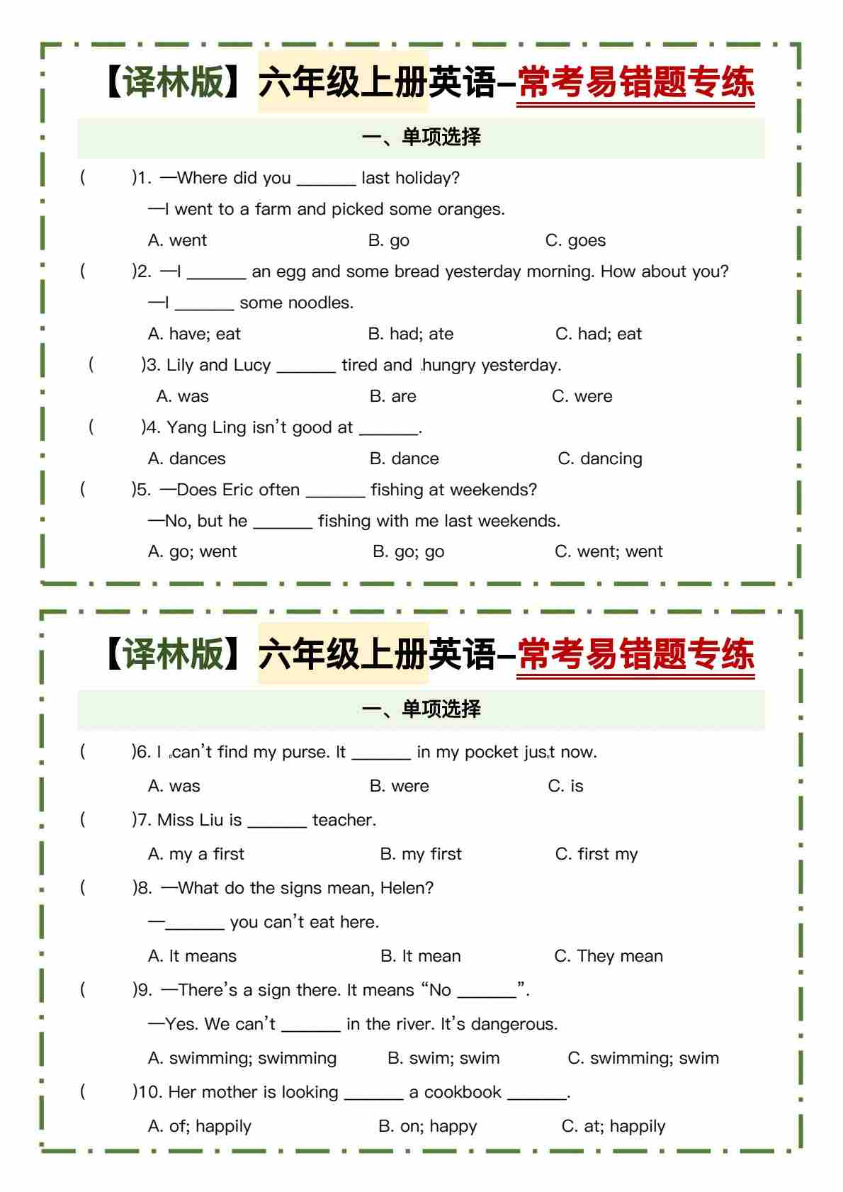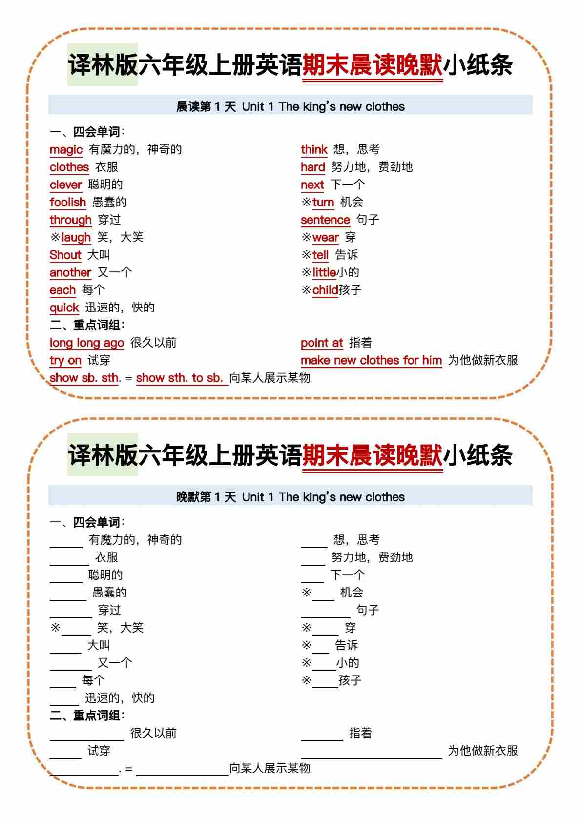 【译林版】六年级上册英语-常考易错题专练小纸条