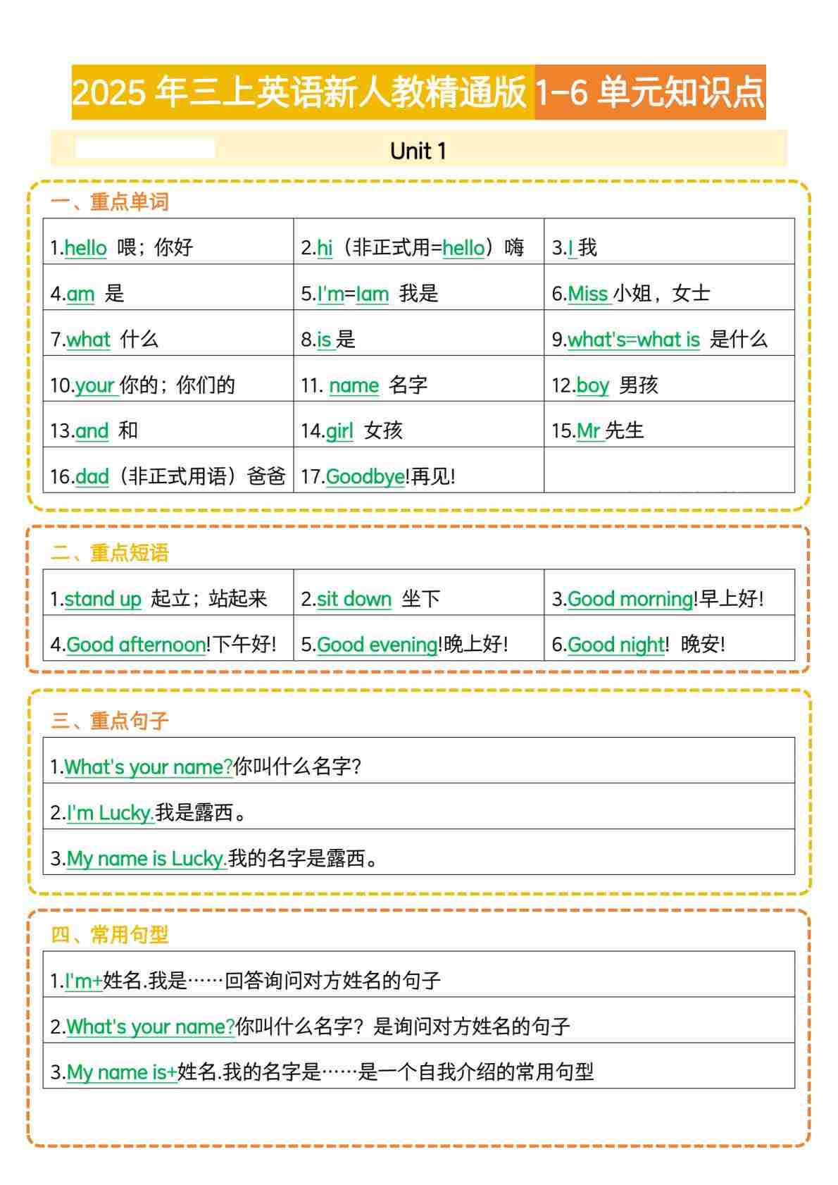 五(下)英语人教精通版【Unit 1 Welcome to our school! 知识汇总及课文翻译】