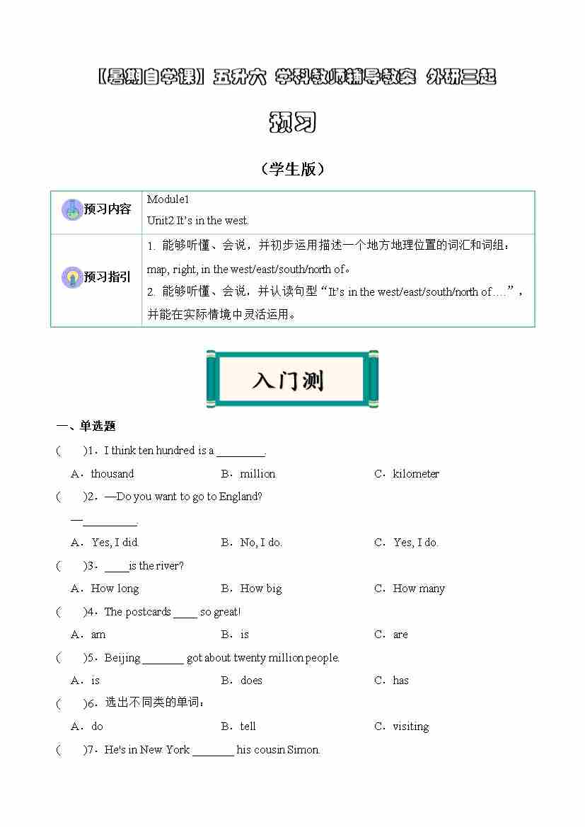 【暑假讲义】五升六课本预习 第10讲:Module1U2预习(外研版三起)(教师版)