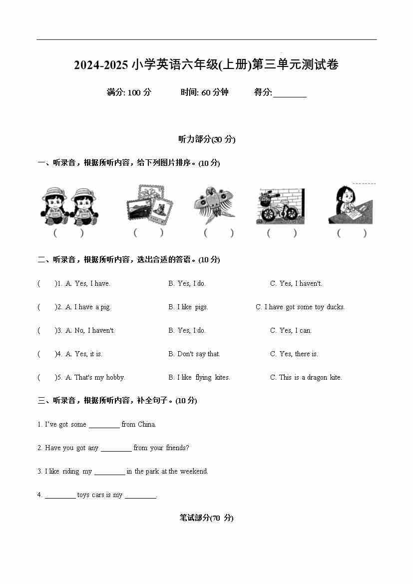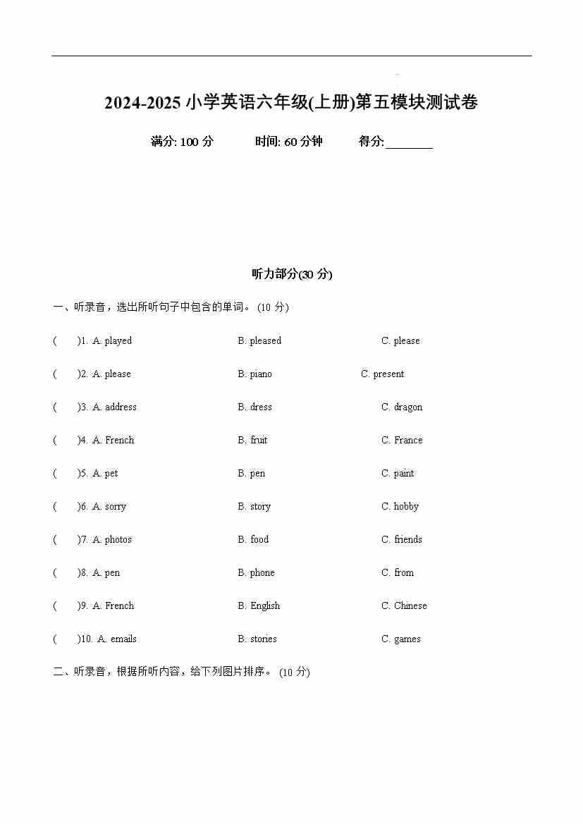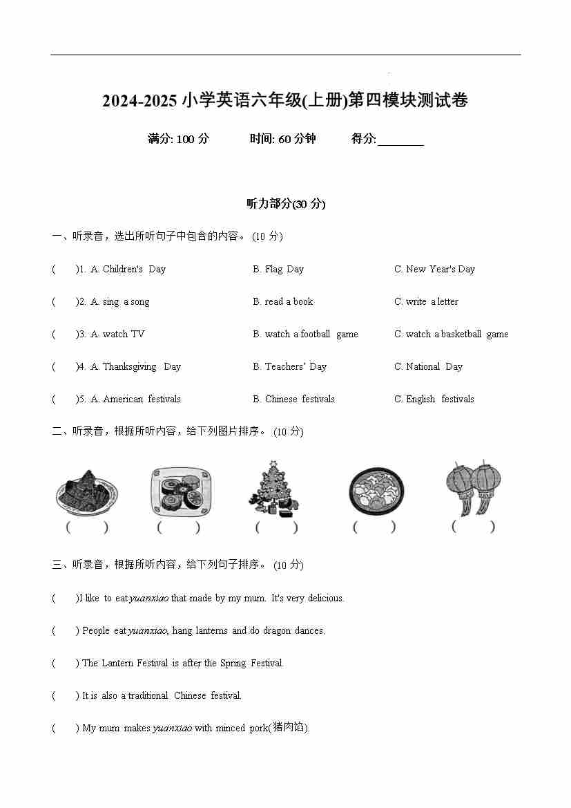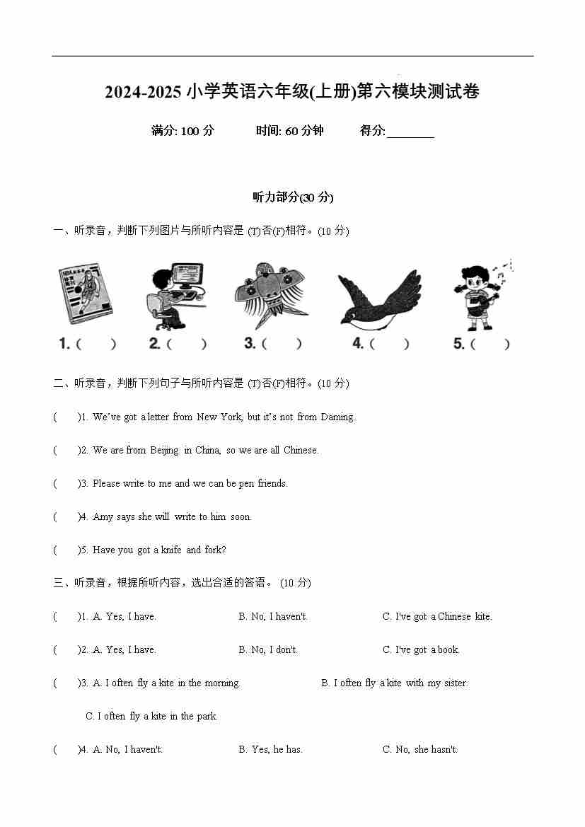 Module 6(单元测试) -2024-2025学年英语六年级上册(外研版三起)