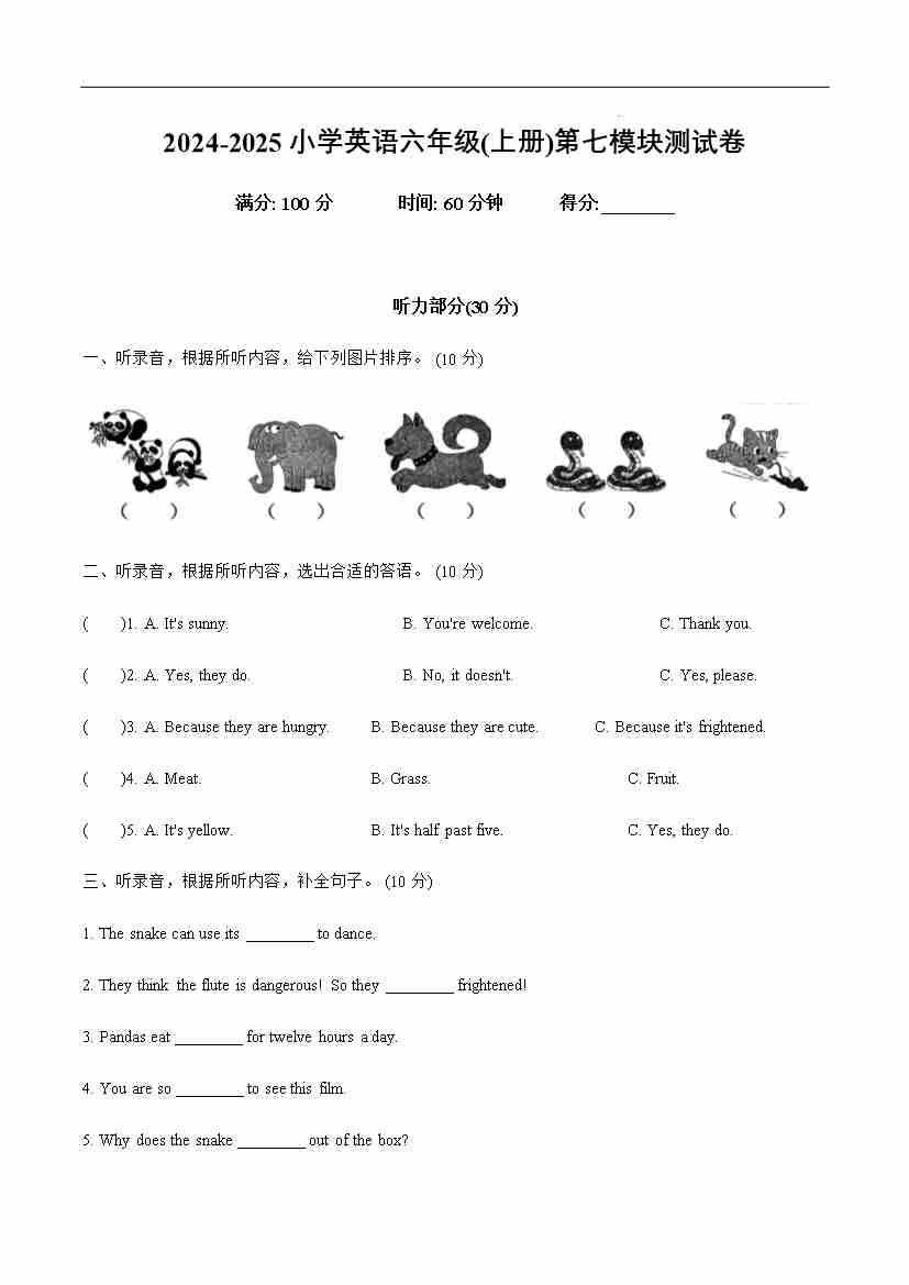 Module 7(单元测试) -2024-2025学年英语六年级上册(外研版三起)