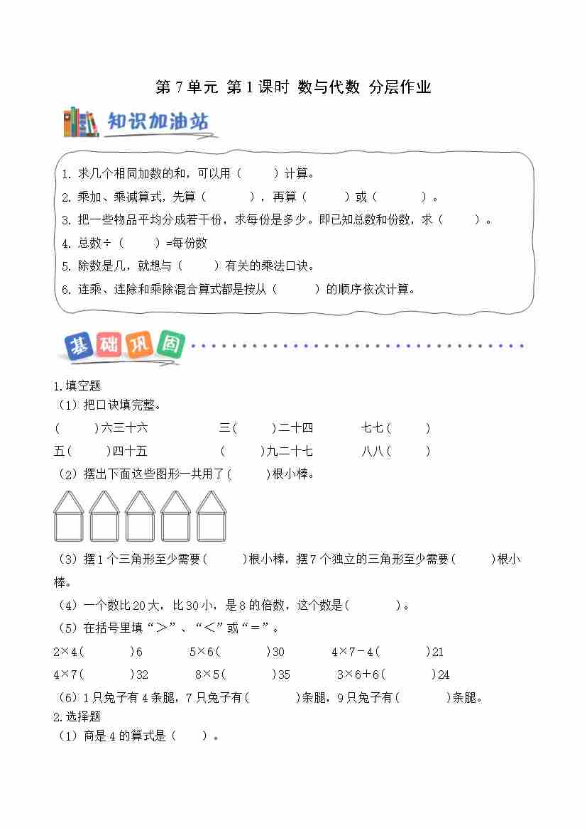 第七单元第1课时 数与代数(分层作业)数学青岛版二年级上册(新教材)