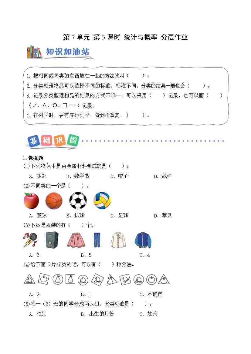 第七单元第3课时 统计与概率(分层作业)数学青岛版二年级上册(新教材)
