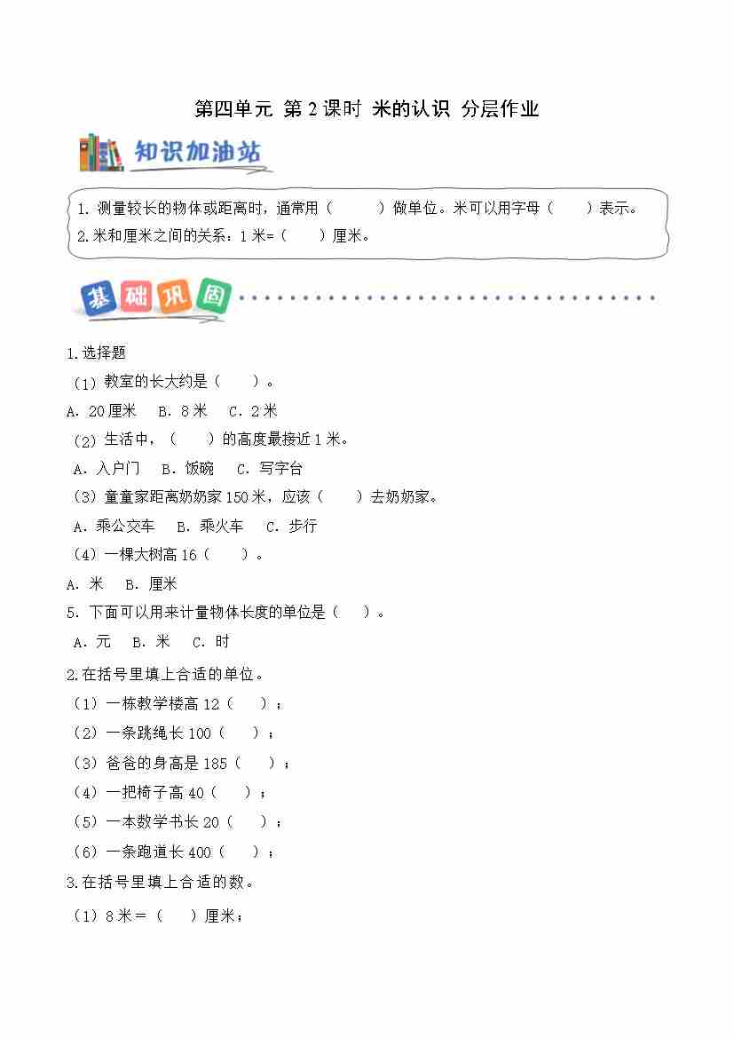 第五单元第2课时 米的认识(分层作业)数学青岛版二年级上册(新教材)