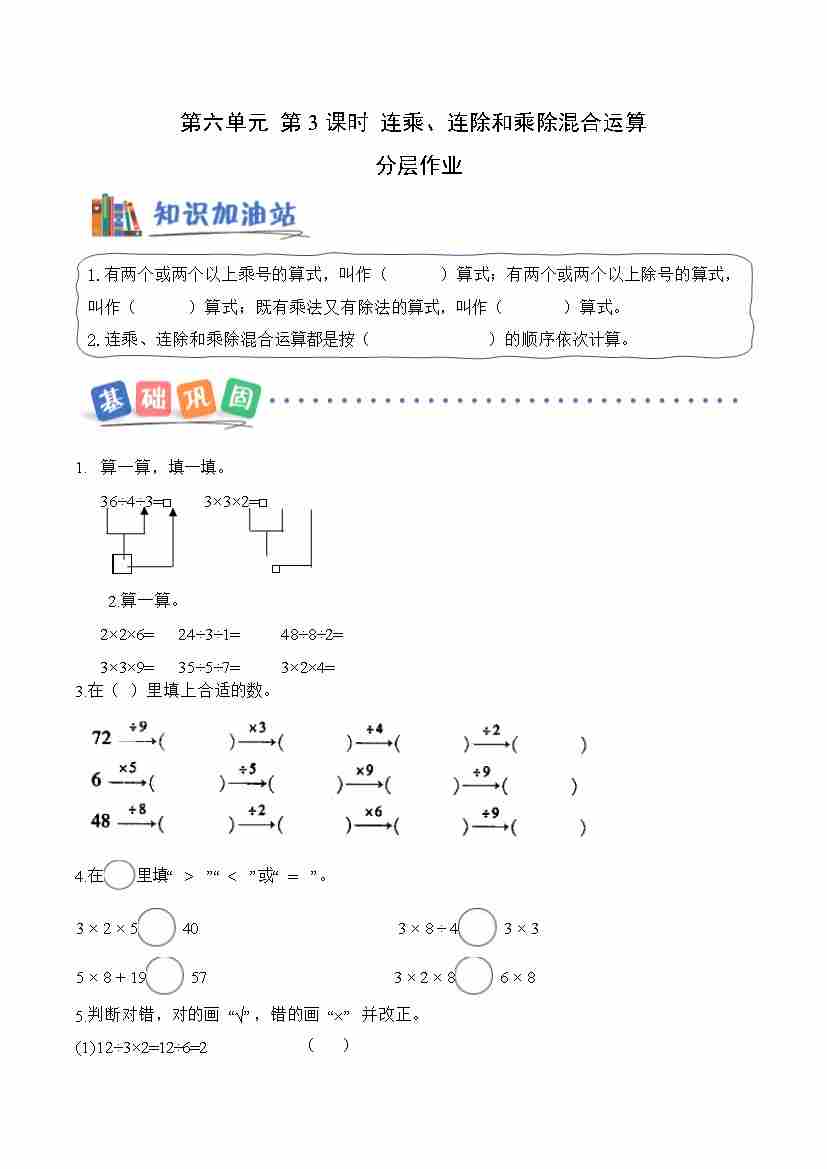 第六单元第3课时 连乘、连除和乘除混合运算(分层作业)数学青岛版二年级上册(新教材)