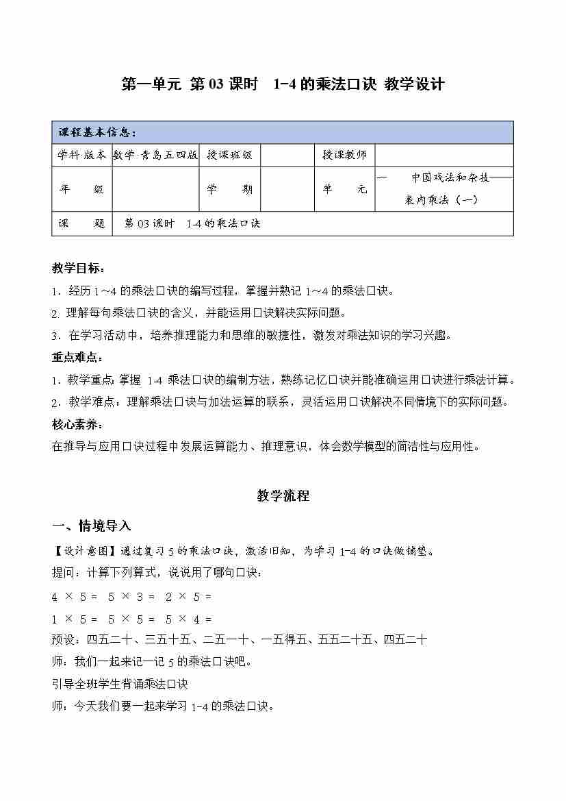第一单元 第03课时 1-4的乘法口诀(教学设计)数学青岛五四版二年级上册(新教cai)