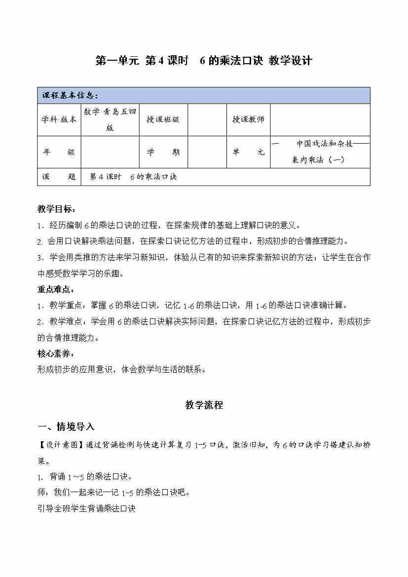 第一单元 第4课时 6的乘法口诀(教学设计)数学青岛五四版二年级上册(新教材)