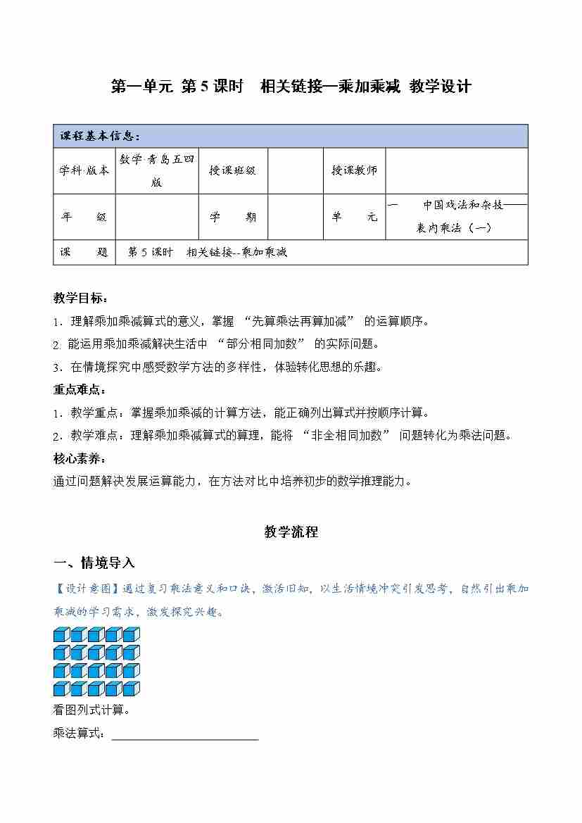 第一单元 第5课时 相关链接--乘加乘减(教学设计)数学青岛五四版二年级上册(新教材)