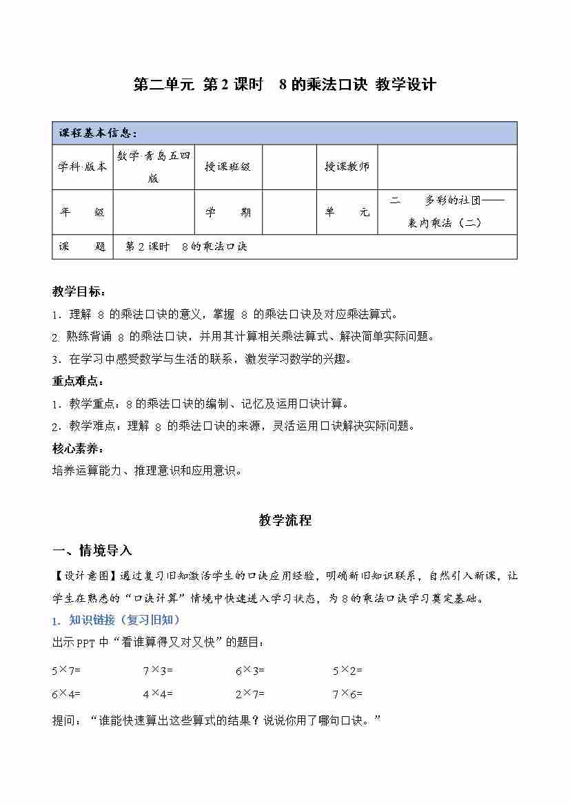第二单元 第2课时 8的乘法口诀(教学设计)数学青岛五四版二年级上册(新教材)