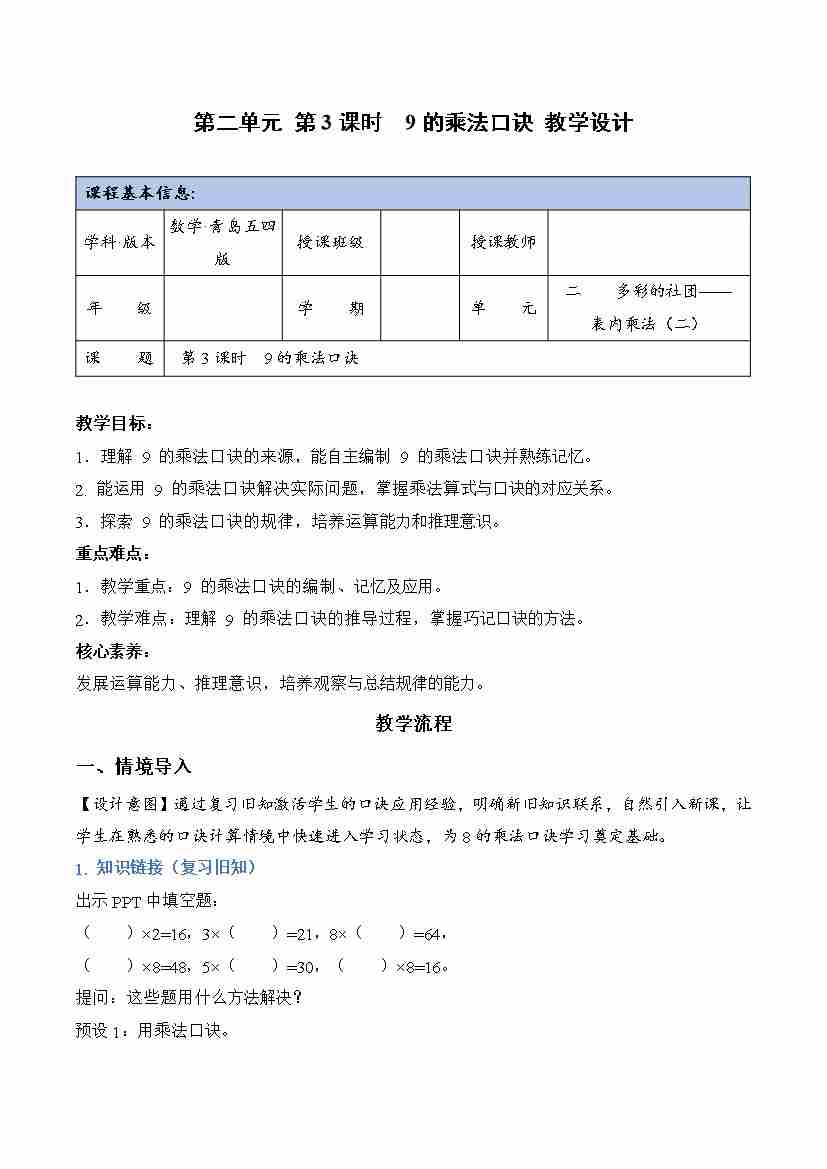 第二单元 第3课时 9的乘法口诀(教学设计)数学青岛版(五四制)二年级上册(新教材)