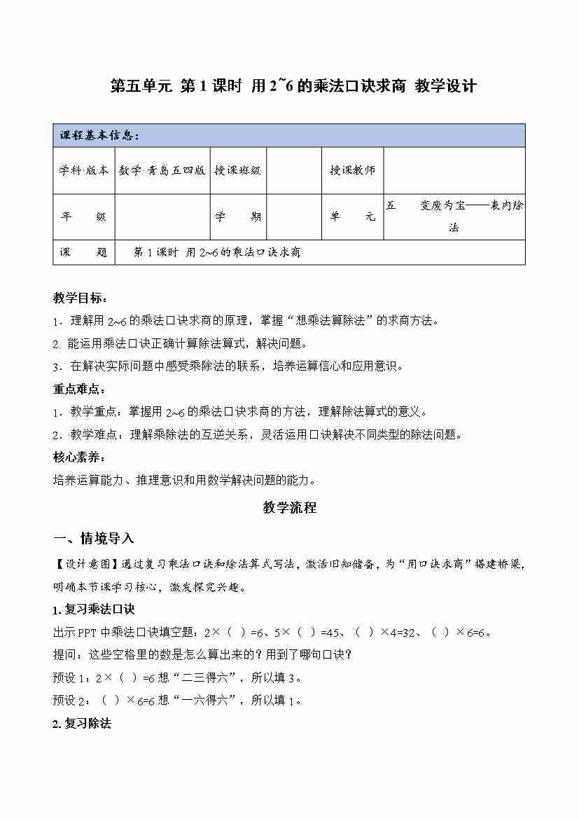 第五单元 第1课时 用2~6的乘法口诀求商(教学设计)数学青岛五四版二年级上册(新教材)
