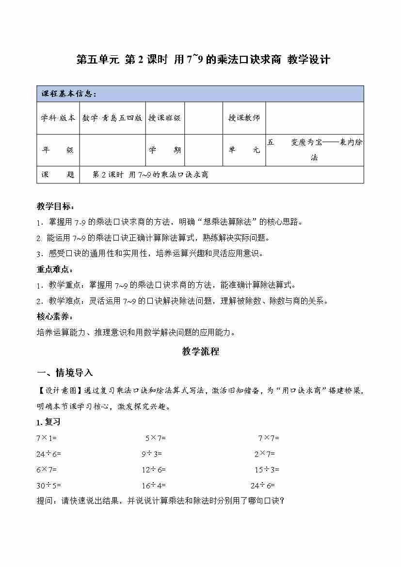第五单元 第2课时 用7~9的乘法口诀求商(教学设计)数学青岛五四版二年级上册(新教材)