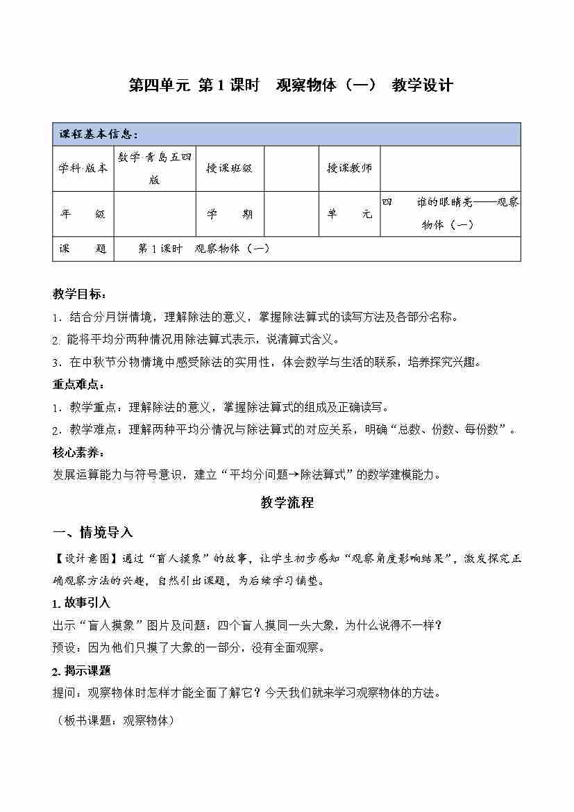 第四单元 第1课时 观察物体(一)(教学设计)数学青岛五四版二年级上册(新教材)