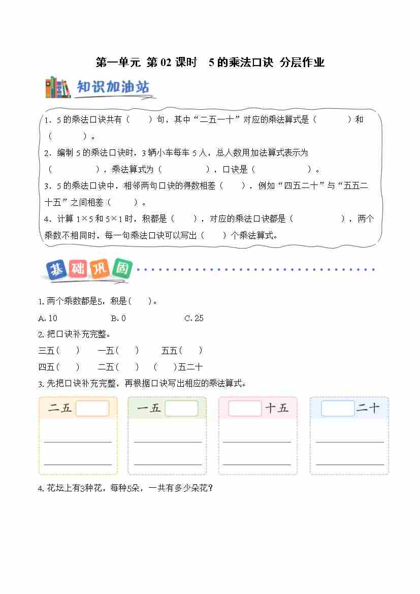 第一单元 第02课时 5的乘法口诀(分层作业)数学青岛五四版二年级上册(新教材)