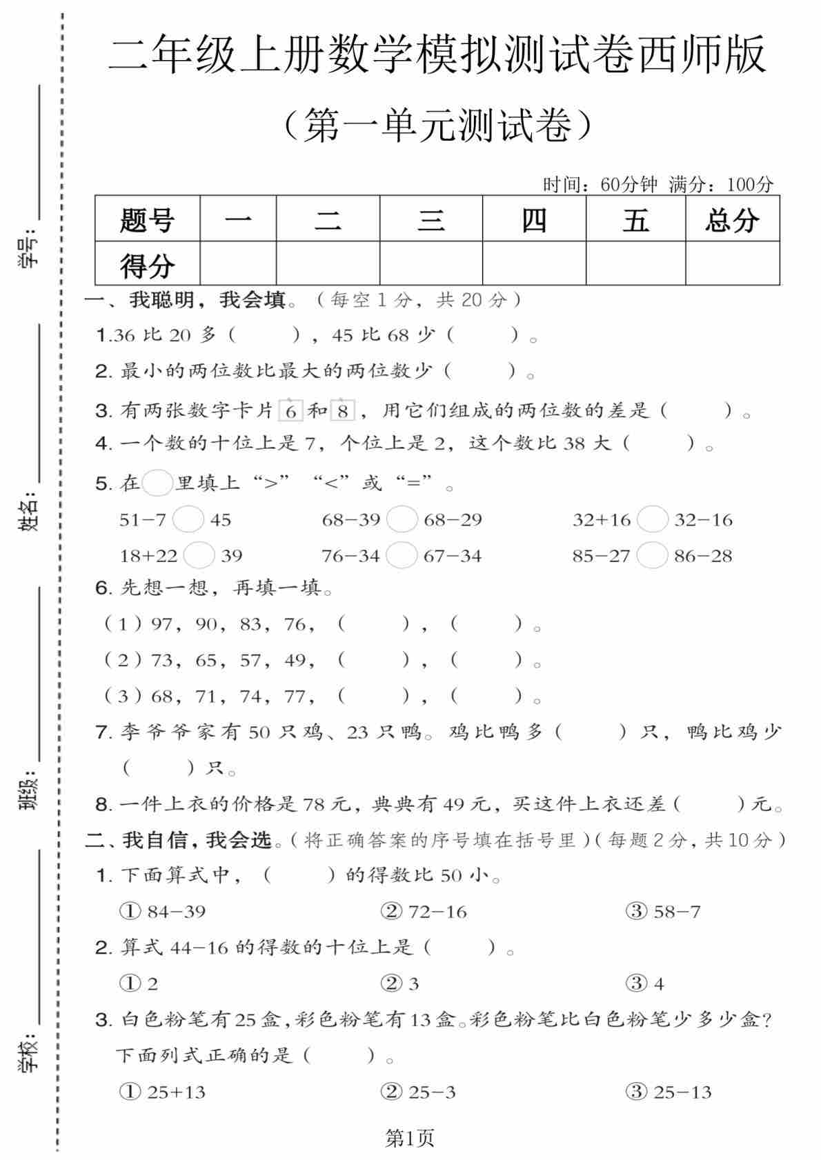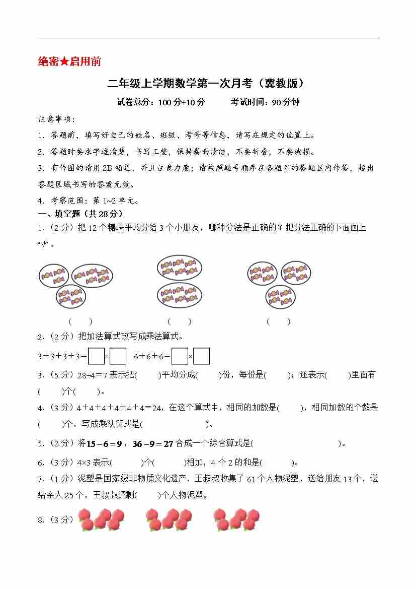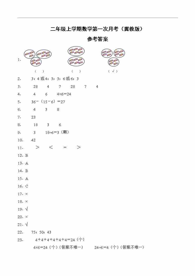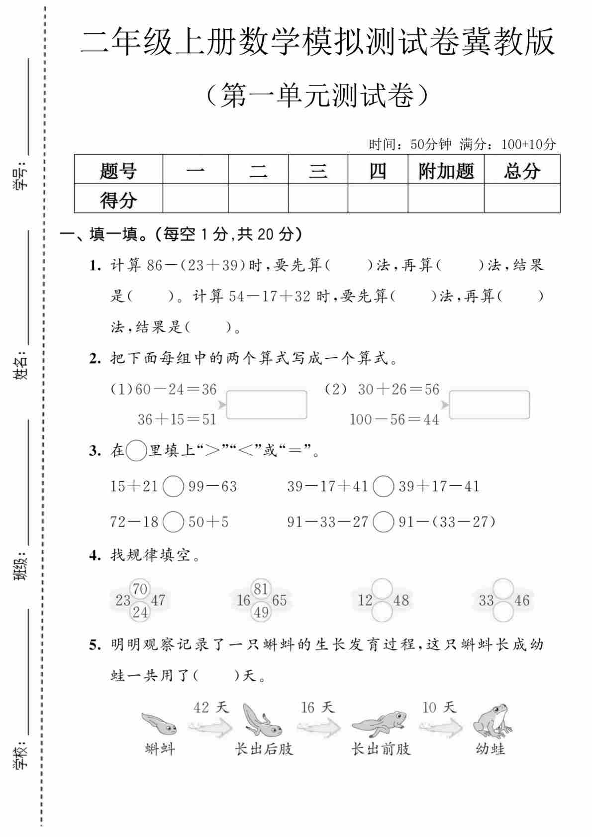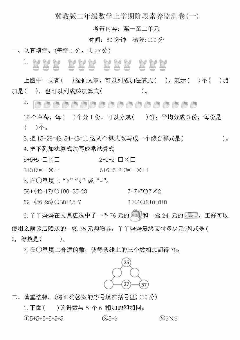 【A4格式】冀教版二年级数学上学期阶段素养监测卷