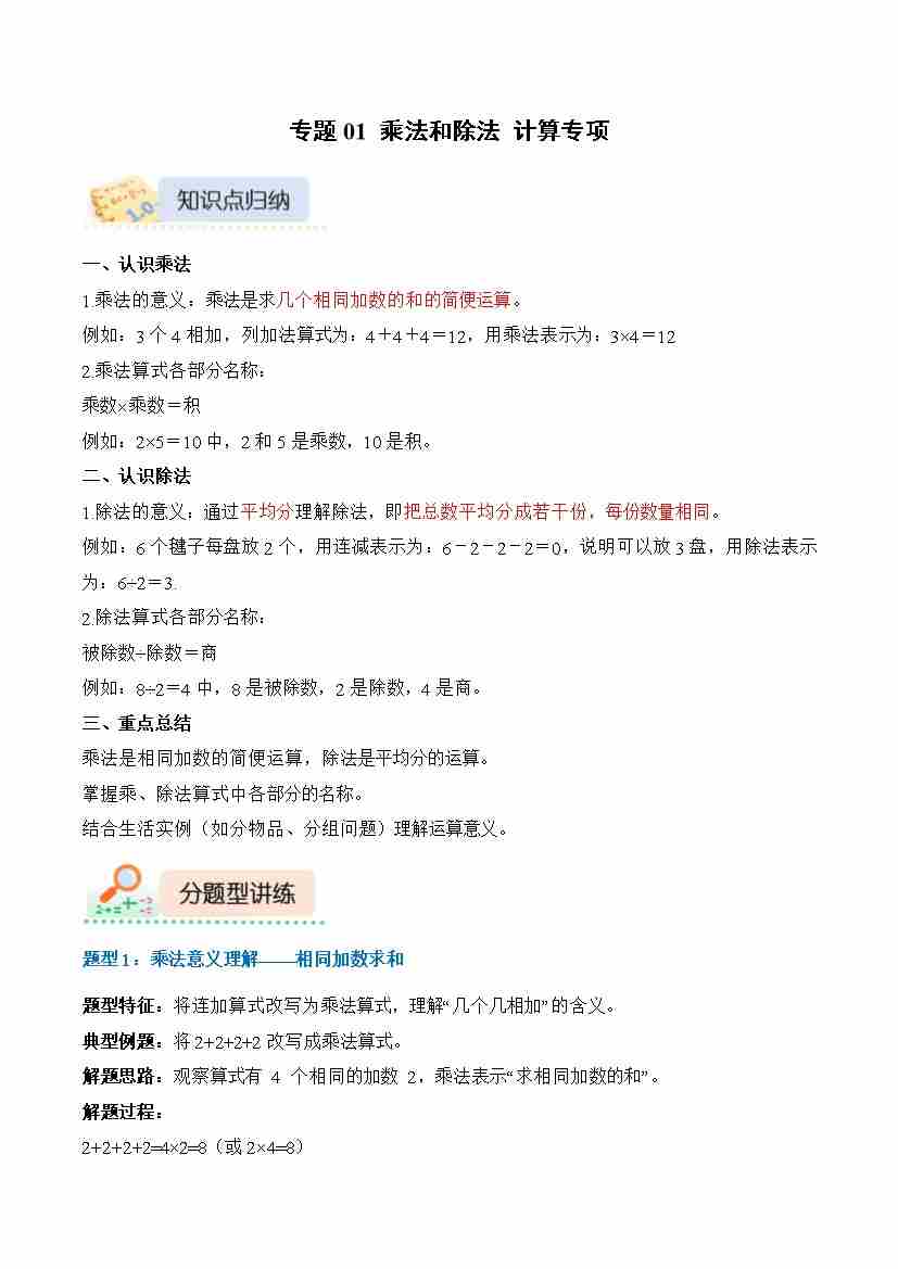 专题01 乘法和除法(计算专项训练)数学冀教版二年级上册(新教材)