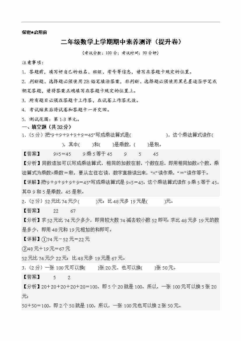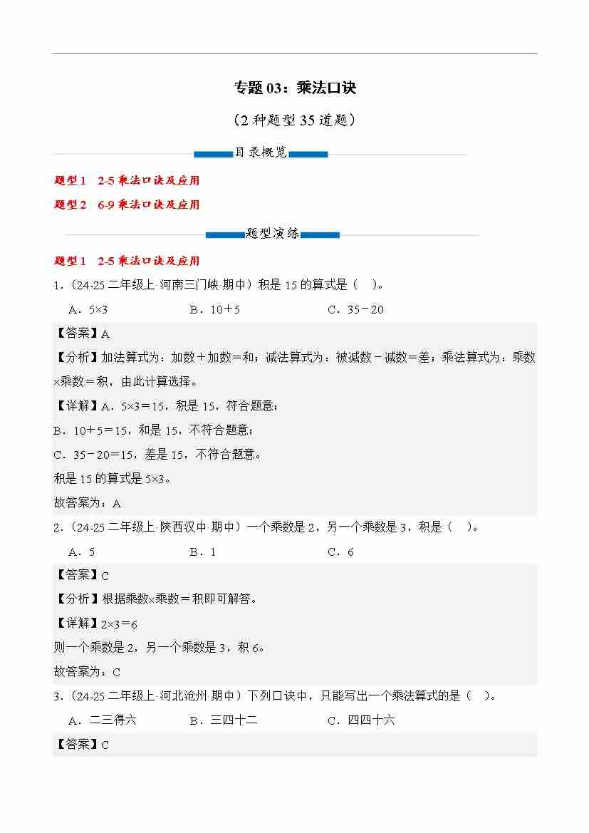 专题03:乘法口诀(期中专项训练)二年级数学上学期(冀教版)(解析版)