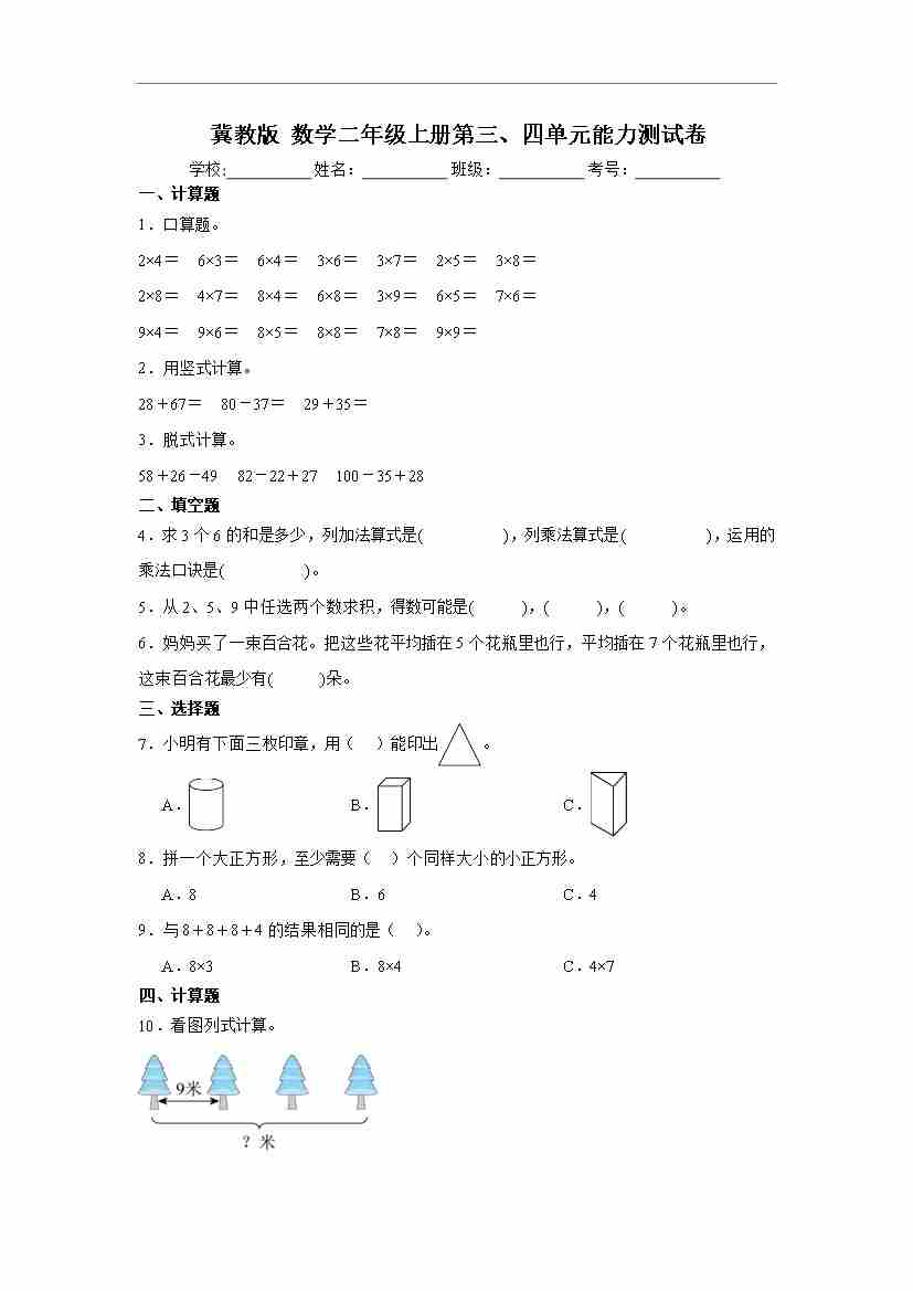 冀教版 数学二年级上册 第三、四单元 能力测试卷(含答案)