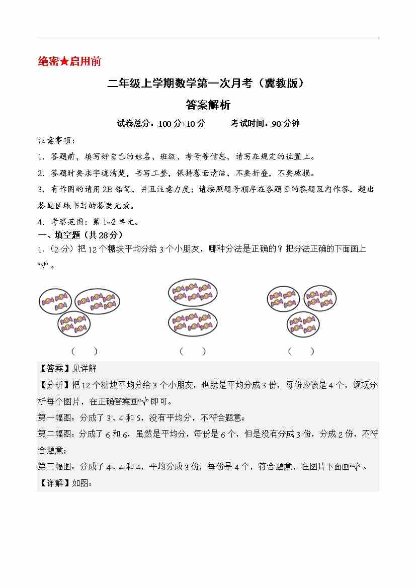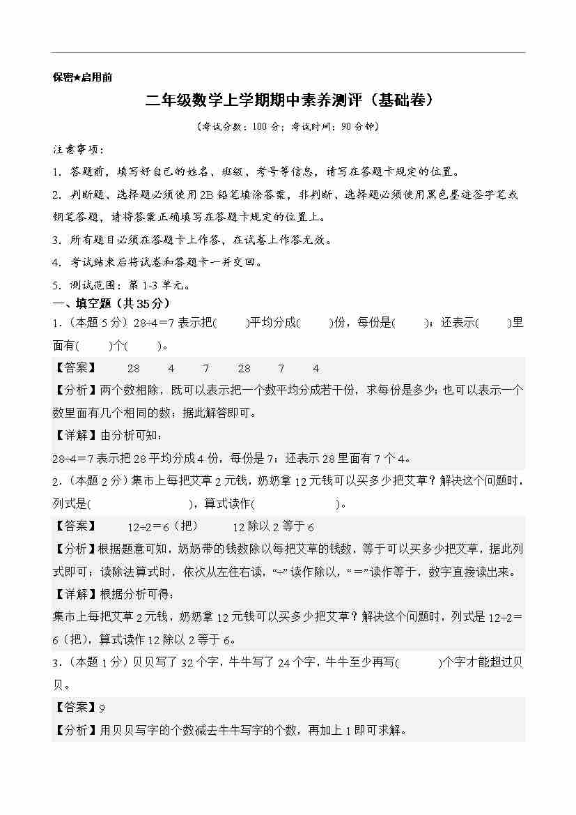 第3单元 传统节日——除法的初步认识(单元测试•基础卷)数学青岛版(五四制)二年级上册(参考解析)