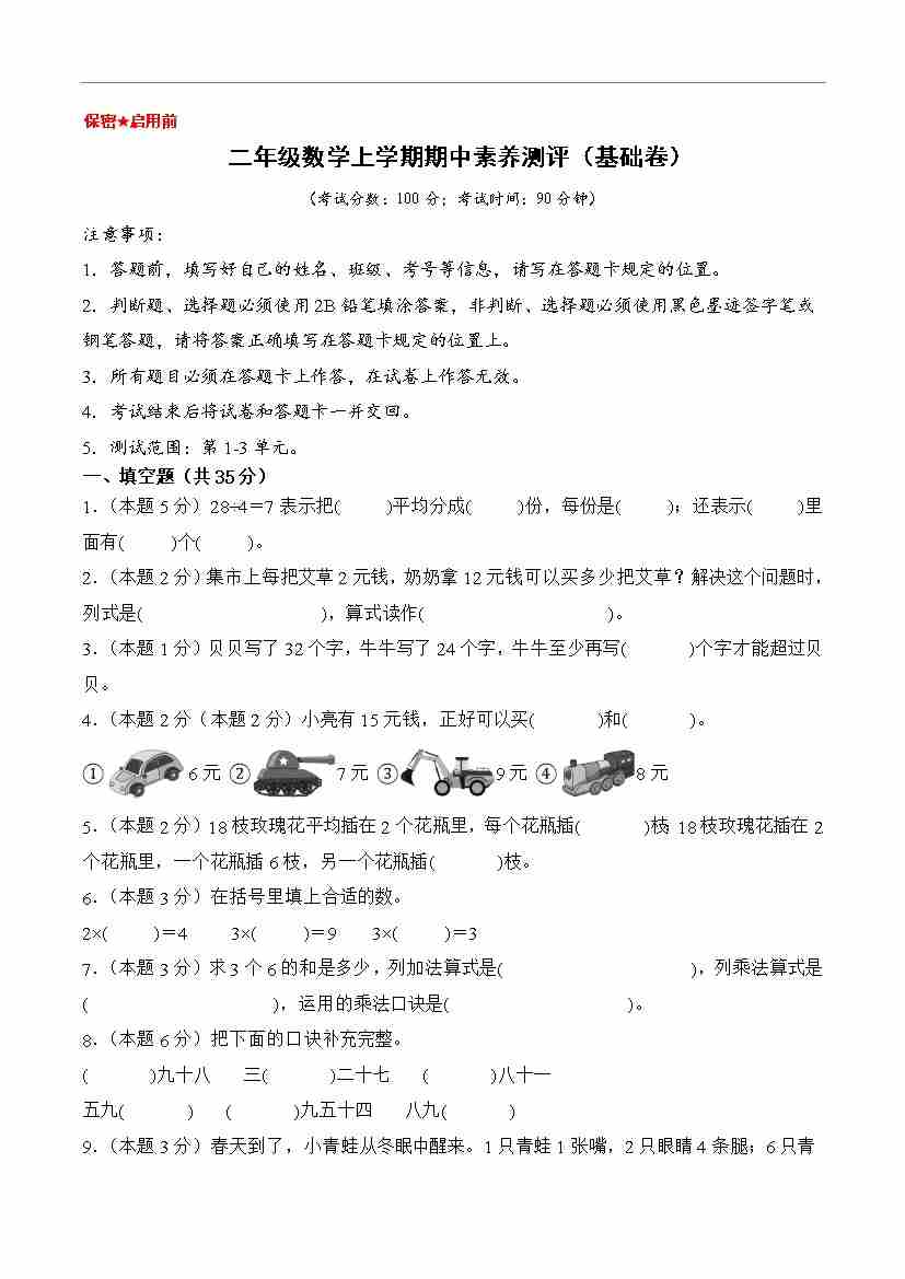 第3单元 传统节日——除法的初步认识(单元测试•基础卷)数学青岛版(五四制)二年级上册(A4版)