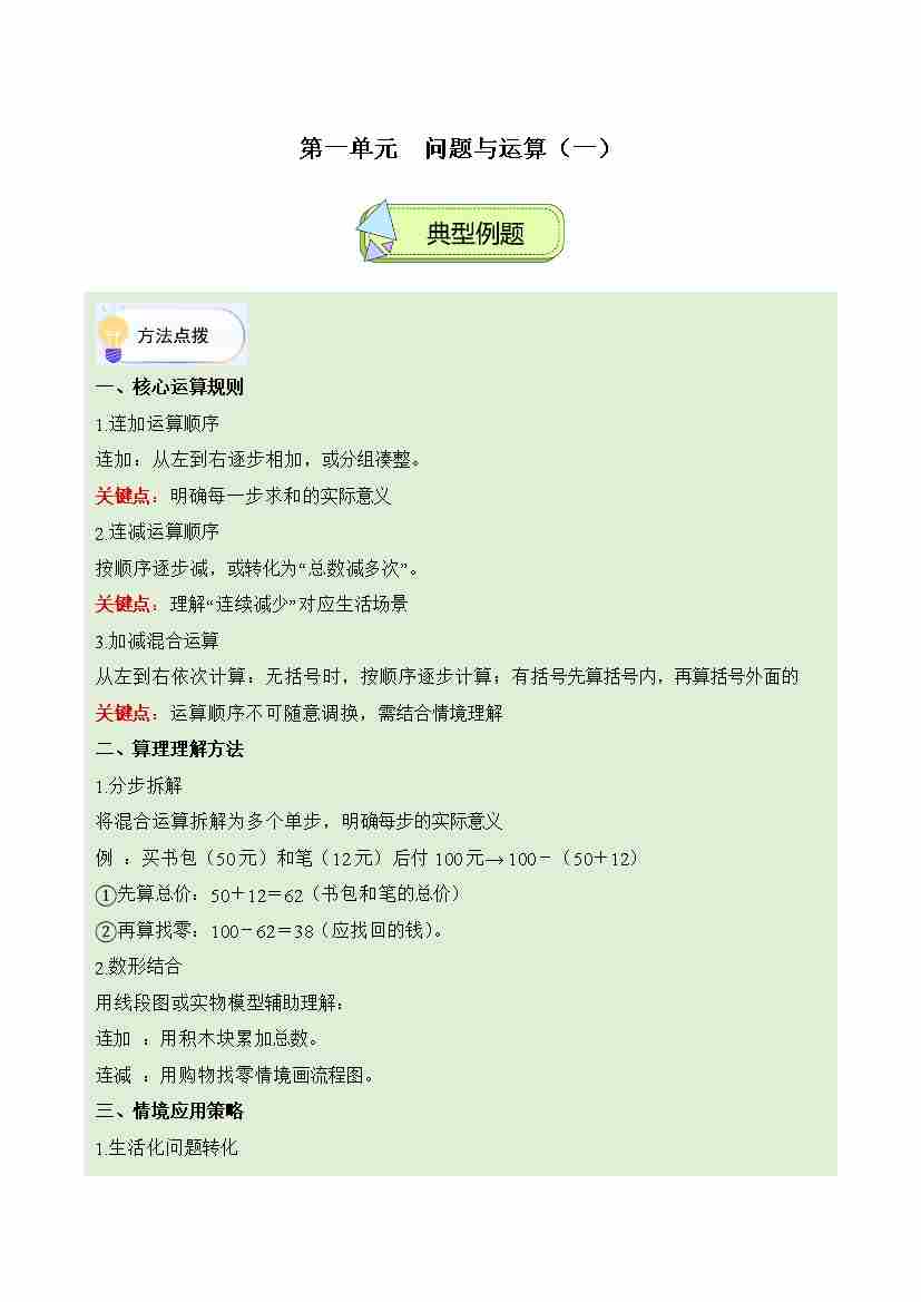 第一单元 问题与运算(一)(解决问题讲义)数学冀教版二年级上册(新教材)